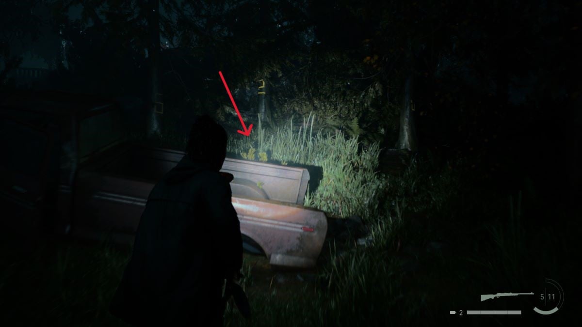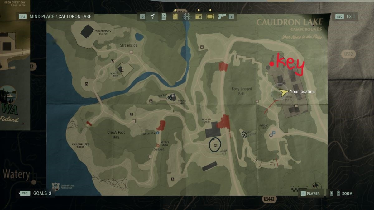 This Cult Stash requires the Boltcutters to access, so it will probably be one of your last Stashes in Alan Wake 2. The Cult Stash is in the bathroom of the Break Room at the southern end of the Rental Cabins area, and the key is on the northern end. The Stash has a drawing of some children’s make-believe instructions and shows a castle gate, a tornado, and a skeleton. Don’t worry about all of that. Using the right side of the Rental Cabins area, walk under a fallen tree, then cross through a house and continue until you reach a rusty pickup truck. Behind the truck are three trees with yellow painted numbers. To my chagrin, I have no idea what these numbers are about, but the key is on the ground right next to the middle tree.