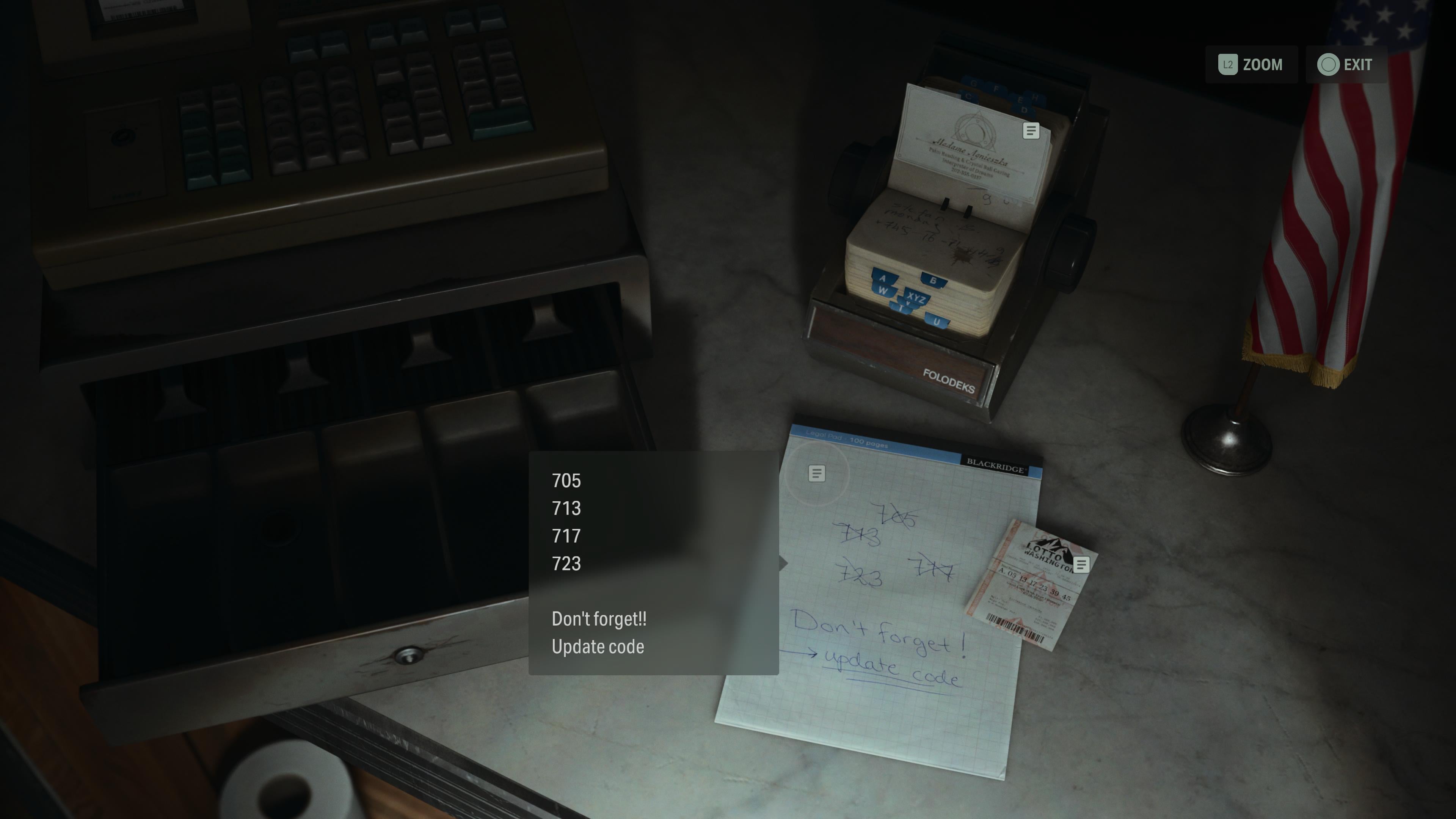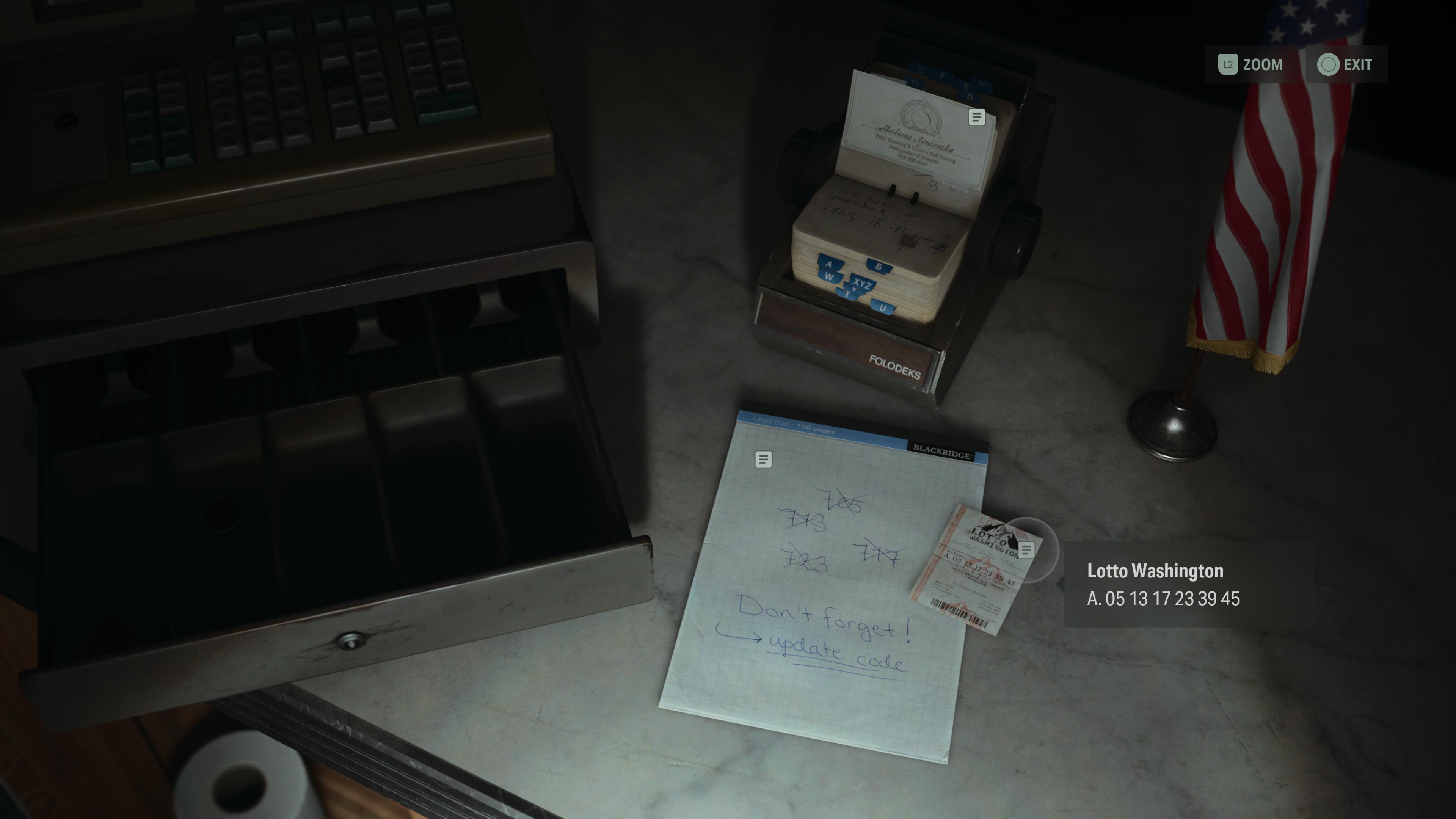 On the counter, you’ll see a couple of readable items: a lottery ticket, a notepad, and a rolodex with a card for Madame Agnieszka. The notepad has a few codes on it that you may think fit the bill, but the note saying “Don’t forget!! Update code” suggests the code has changed. It has and you need to use the notepad in conjunction with the lottery ticket to get the code.