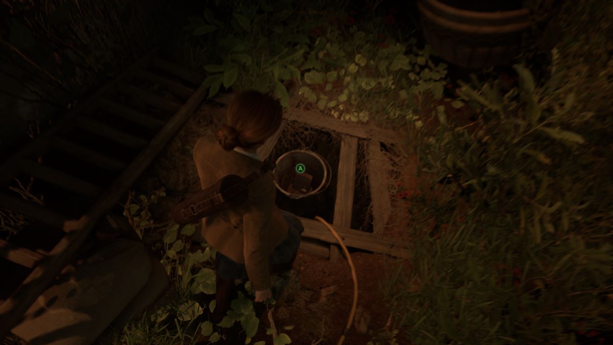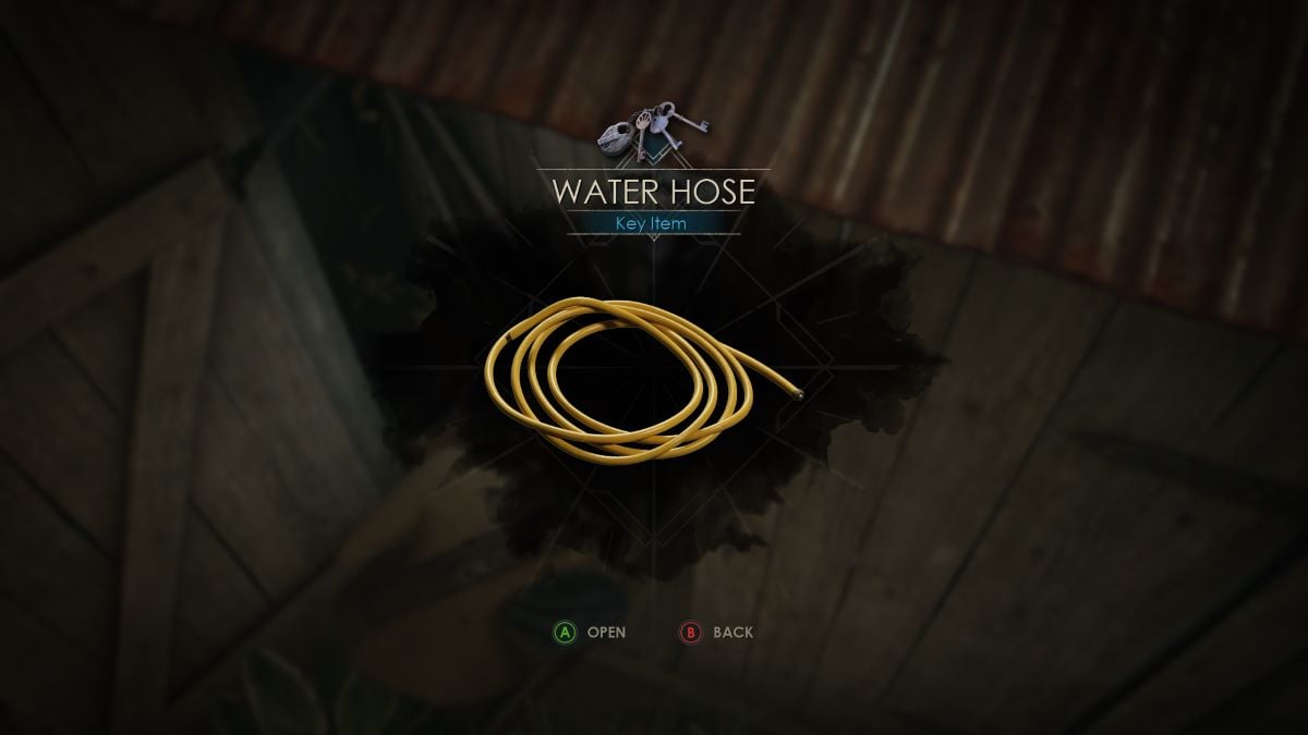Return to the well, and you will see that a garden hose ends just before reaching the well. Trace the hose back to its faucet, which is right next to the bolted shed. Turn the water on, then use the Bolt Cutter from the Small Parlor to cut the lock on the shed. Inside, grab the hose extension and return to the well. You can now attach the hose from the shed to the end of the one from the faucet, and with the extension, the water will reach the well and fill it up. Wait a couple of moments, and then you can reach the bucket floating in the well and grab the Astronomical Clock plate piece.