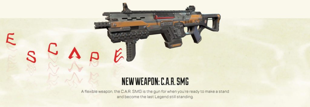 The website also shows off the latest weapon, the C.A.R. SMG. Respawn calls it “a flexible weapon,” stating it’s “the gun for when you’re ready to make a stand and become the last Legend still standing.” The C.A.R. joins the Volt, the R-99, the Prowler, and the Alternator on Apex’s list of SMGs. It’s not clear just yet what ammo category the C.A.R. falls into.