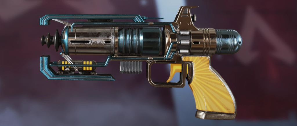 There’s only one more pay-to-win Wingman skin, and this one takes The Death Ray design and goes all the way out there with the colors. Where most versions of The Death Ray and Merciless Wing tend to stick with slightly duller metallic tones, The Sunburst opts to give players a bright banana yellow grip with metallic teal accents. It’s a very different look from the rest of this family’s recolors, and it is best for people looking to stand out. It requires The Death Ray to be unlocked, and then for it to become available in a Store rotation, where you can unlock it for 10,500 Legend Tokens or 1,800 Apex Coins.