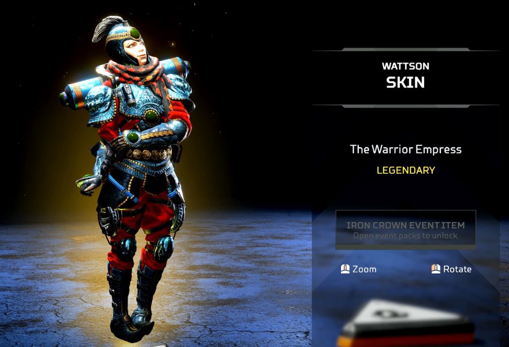 Another extensive do-over to Wattson’s look, The Warrior Empress has its own unique armor for the character. This has loads of detail, including skulls on the shoulder pads and gems on the headband, chest piece, and hands. Warrior Empress Wattson simply looks fantastic in-game. While it’s another old skin that’s only reappeared in the store a few times, it was most recently offered to players during season 12’s Unshackled event.