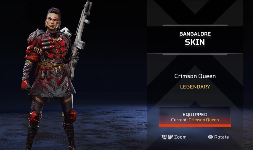 Finally, there’s Crimson Queen, the recolor of Bangalore’s Outlands Warrior skin that got the red-and-gold Anniversary Collection treatment. Bangalore’s hair and face paint give her an incredibly striking and intense look, while the red on black flak jacket and pants look more natural on Bangalore and this skin than possibly any of the other anniversary recolors.