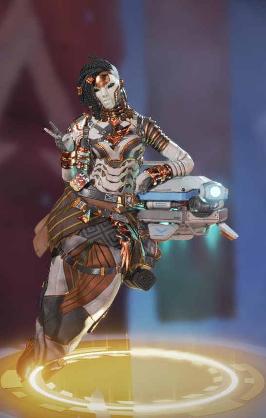 Lifeline’s Ghost Stalker skin was a rework of Judge Jury Executioner, which came out during the Iron Crown event in 2019. The asymmetric hair styling and mask are clearly the focal points of the skin, but the change in accents from gold to bright metallic copper make the skin pop.