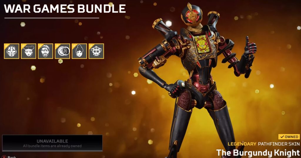 Another entry from the War Games collection, Burgundy Knight is the recolor of the much-beloved War Machine Pathfinder skin from the Iron Crown event. The switch to a black base with red and gold accents in Burgundy Knight makes the skin better than ever.