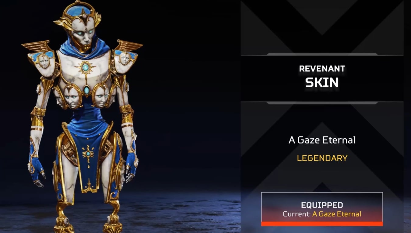 Usually, Respawn likes to make Revenant’s terrifying presence as obvious as possible. His Legendary skins turn him into demonic relics, ancient gods of death, various robotic merchants of death, and even the Big Bad Wolf. A Gaze Eternal from season eight’s Chaos Theory event is the odd skin out, and it’s perhaps the scariest of the bunch because of it. Crowned in royal blue and gold, Revenant gets a blank, marble face and pupil-less stare befitting the name of the skin. In fact, he gets several stares, as the skin is covered in the same blank face, making sure you’re being watched from every single angle. It’s a strange and unsettling skin as opposed to a stereotypical “scary” one, and it still stands out as one of the most unique takes Respawn has ever given players on Revenant, or any of the characters in the Apex universe.