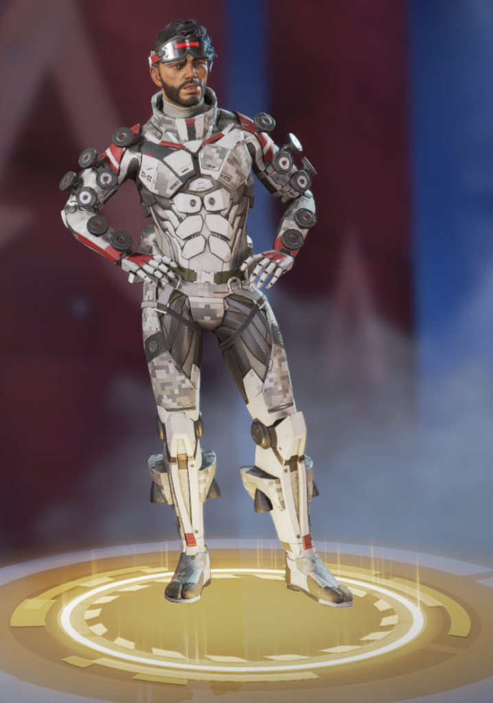 This Legendary skin can be crafted in the legend customization tab for 1,200 Crafting Metals at any time. Since there’s no need to wait for a store rotation or upcoming event, it’s a perfect choice for players new to Apex or those who’ve recently switched their main to Mirage. Ghost Machine dresses Mirage in a white camo-themed bodysuit with crisp red accents while retaining iconic parts of his base design in his goggles and arm attachments. The armor on his stomach resembles a six-pack of abs, and the same protective plating can be found on his shins.
