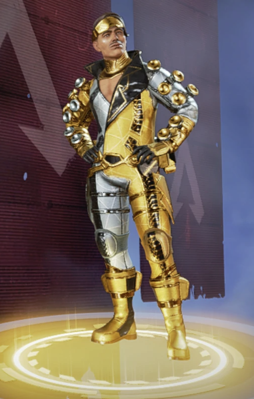 In this disco-themed look, Mirage wears a mostly golden bodysuit and high-fashion accessories. The shiny bodysuit is the real highlight of this skin, with its black and white accents and diamond-shaped back cutout. It’s simple yet classy, featuring a subtle line patterning that resembles Olympus’ landscapes and draws in the eye on closer inspection.