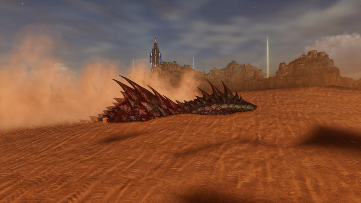 When you have located a Fasolasuchus hiding in the sand, use explosives to inflict damage and force it to exit. A brief stun period triggers on the Fasolasuchus allowing you to mount it and provide temporary control over the creature.
