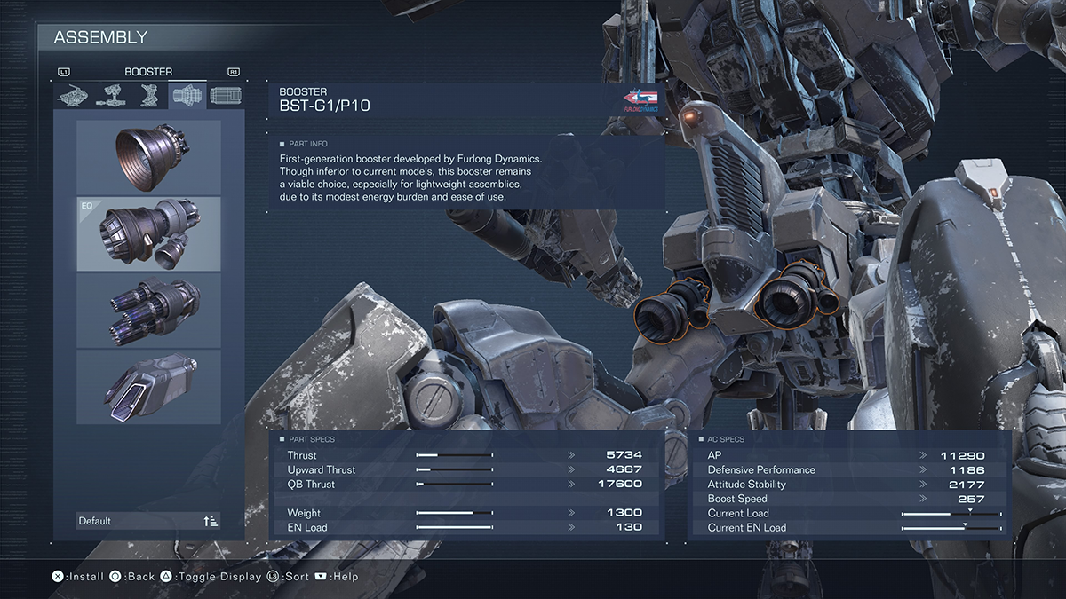 You’ll hardly need to go verticle in this fight so focus on boosters that will give you forward thrust as well as help you dodge. The BST-G1/P10s will fit the bill.