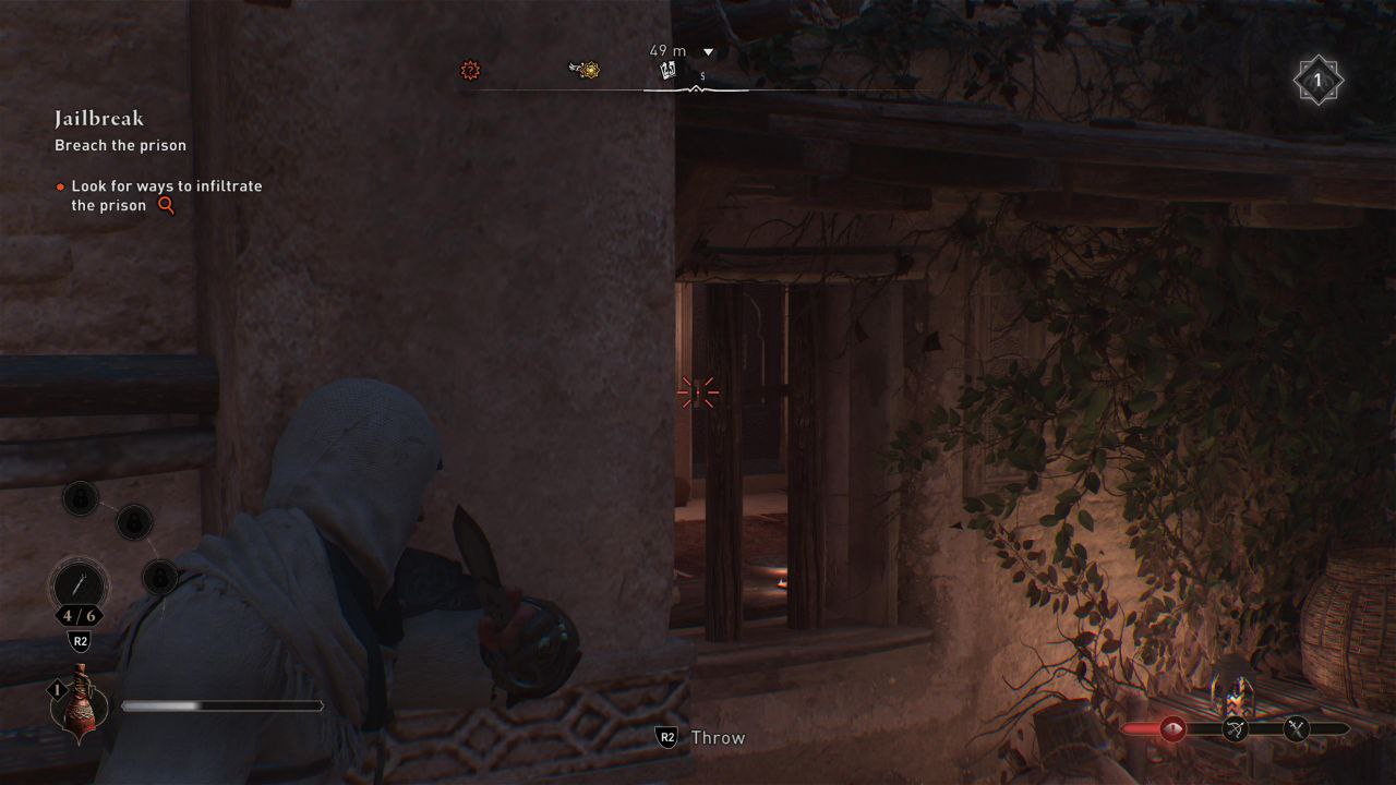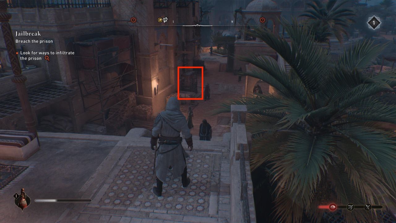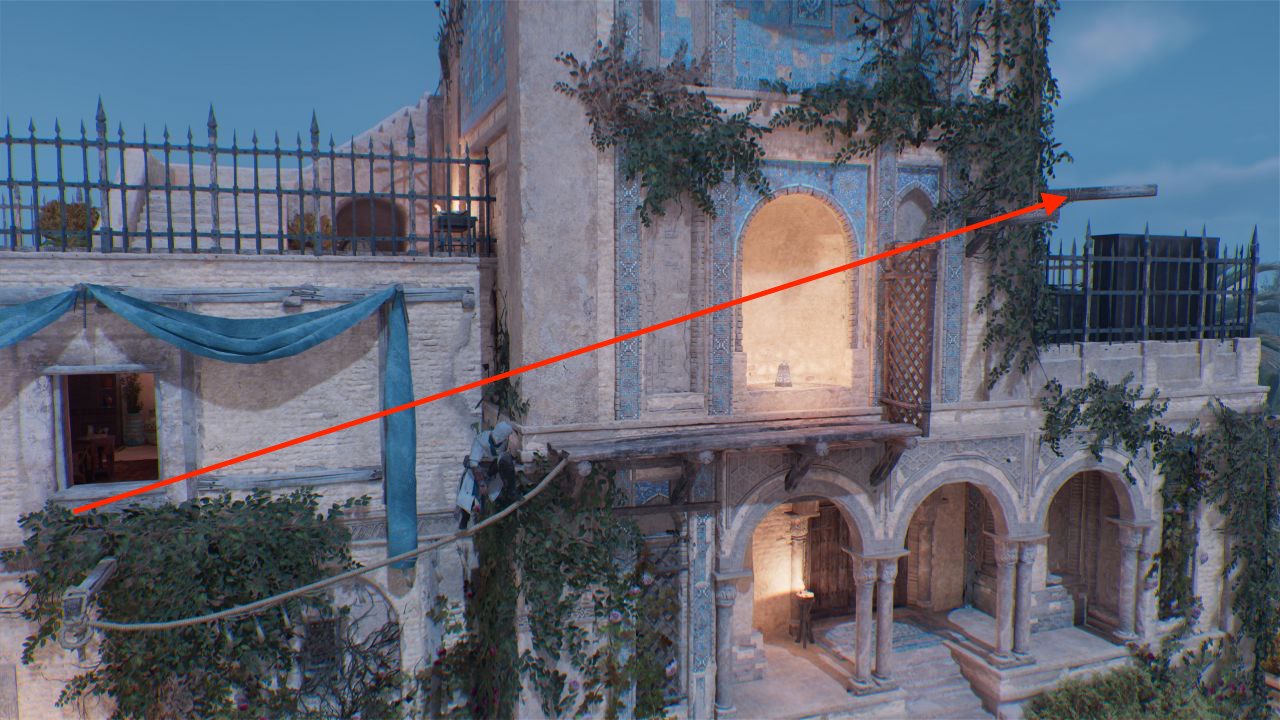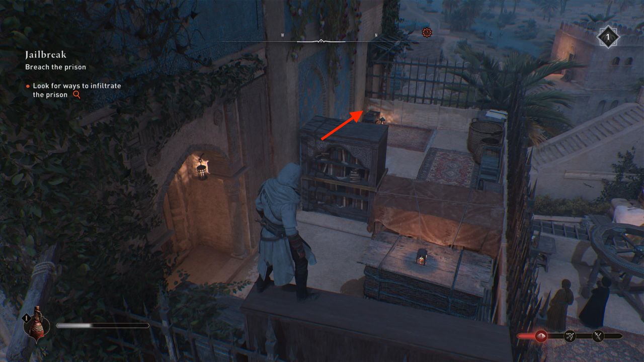 Finding the second page will be more difficult since you’ll need to break into the Observatory first. Climb down the stairs where you found the first paper, move the bookshelf, and then climb on top of it. Throw a knife inside so you can use the front door to enter. Return to Al-Mahani’s side and enter the building from the door behind his bench.