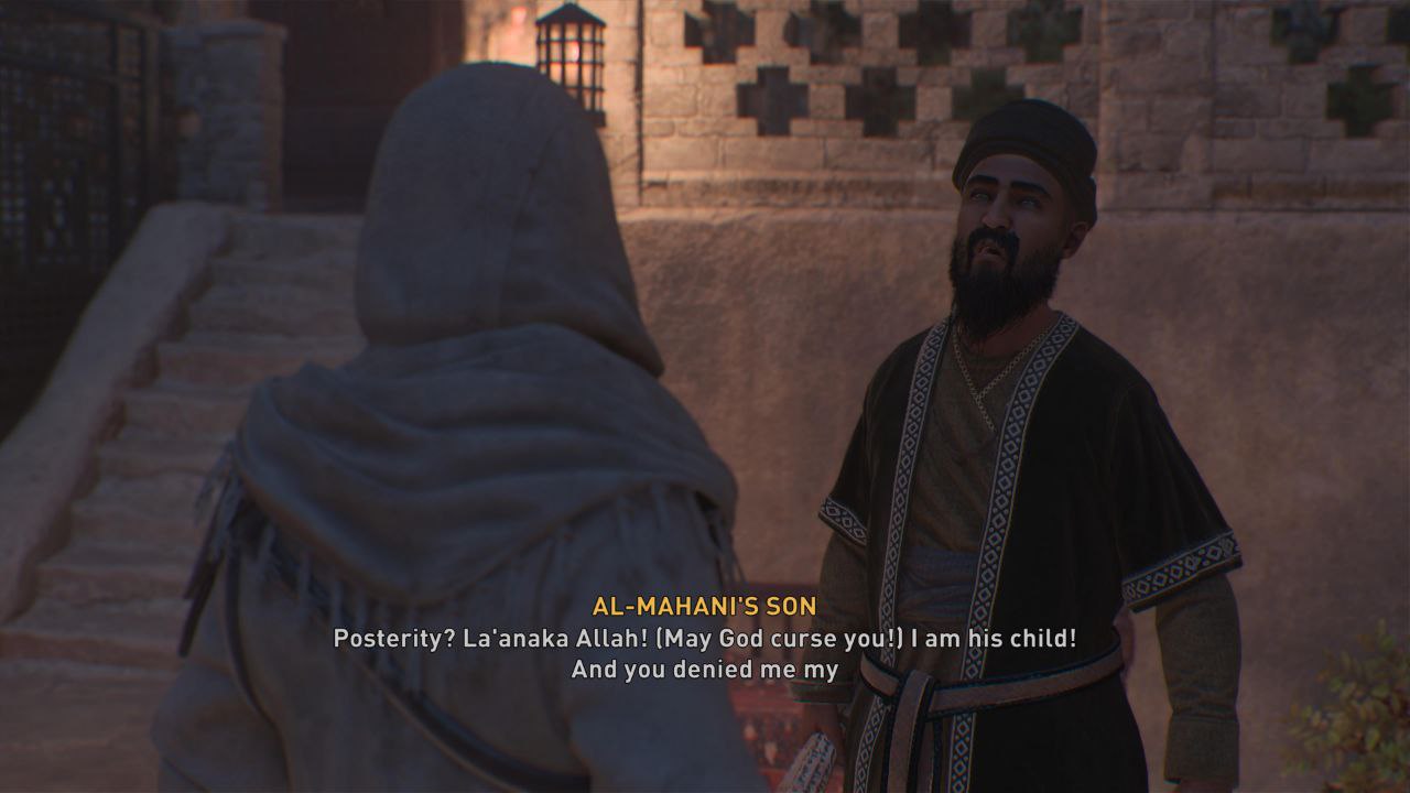 Upon returning to Al-Mahani’s location, you’ll find out he has passed away while you were collecting the papers. This is an event you can’t prevent, and AC Mirage will present you with two different dialogue options while talking with Al-Mahani’s son: