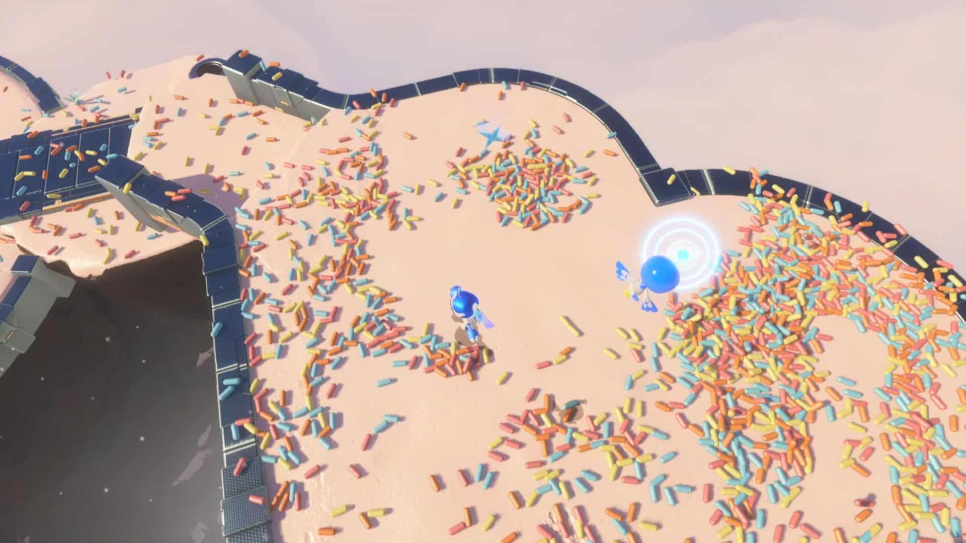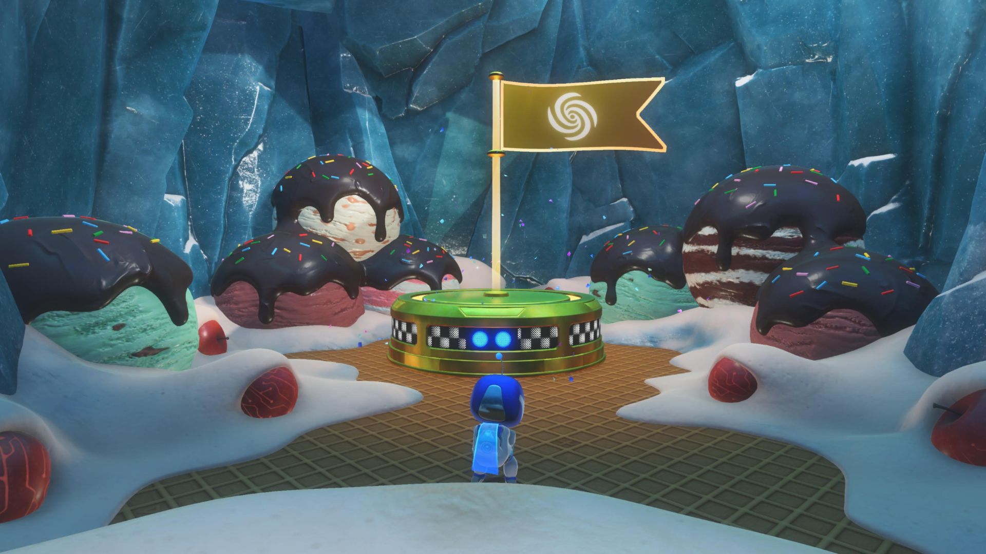 Bot four is easily the hardest to find in Creamy Canyon, and it took me three attempts. After bot three, carry on and progress through the linear path, and shortly after, you should reach a platform with sprinkles and a charging pink enemy. Use the enemy to smash the ice block to reveal a glowing blue cross in the area shown above. Hold down square to charge up Astro’s spin attack, and he burrows his way underground. Strike the red enemy down here to give you easy access to the fourth bot dangling from the wall.