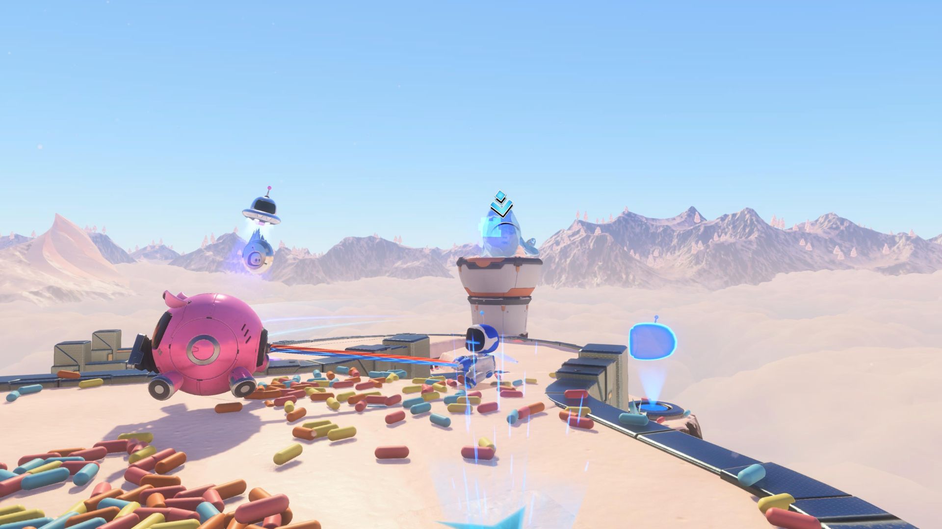 After you trigger the final Creamy Canyon checkpoint, another couple of glacial obstacles obstruct your path. Use a red enemy one last time to remove them, climb the ramp, throw the pink enemy at the large enemy blocking the end of the level, and make bot seven appear—you can’t miss them.