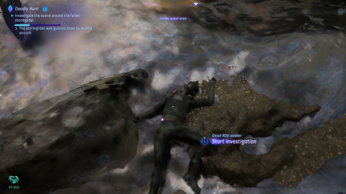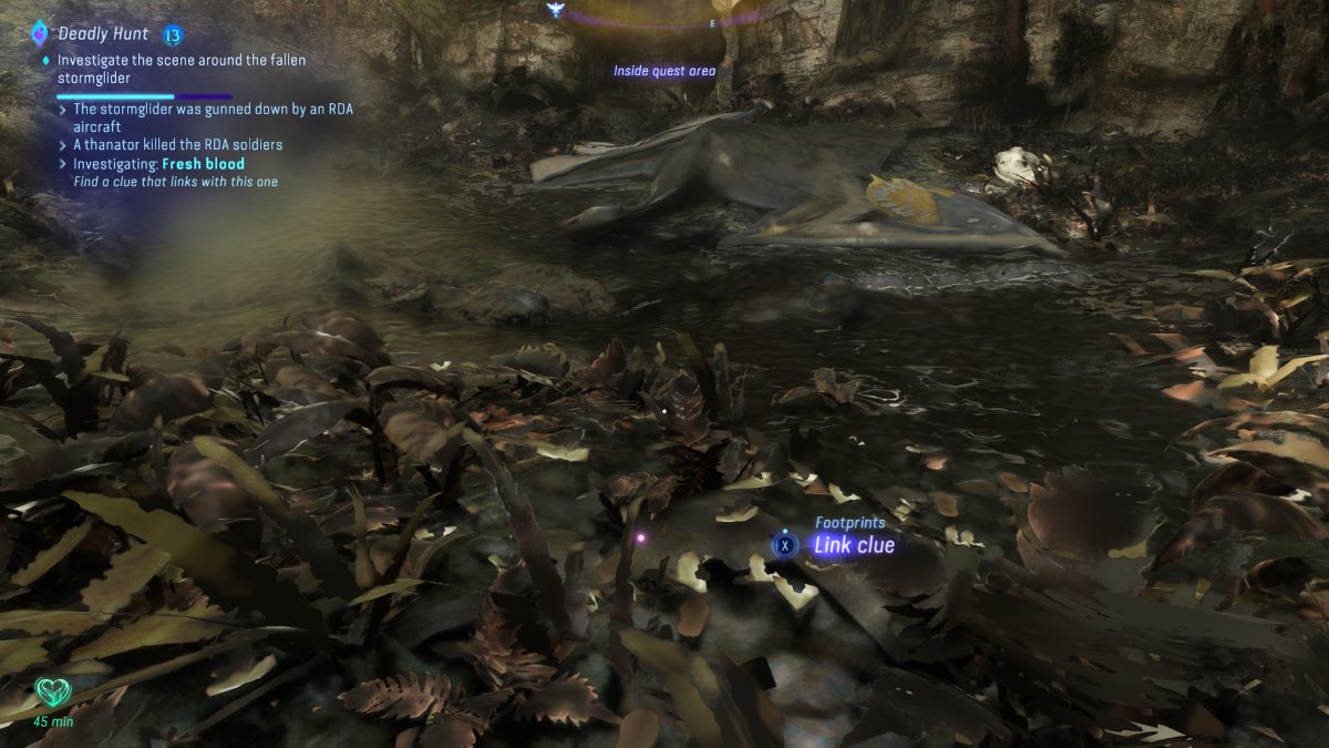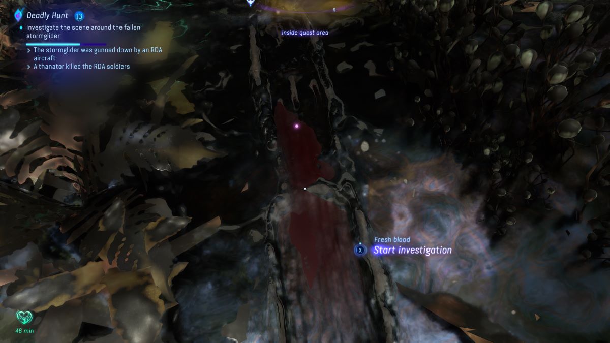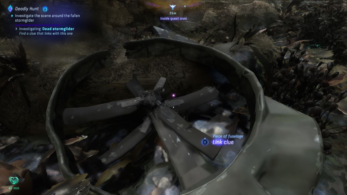 Deadly Hunt begins when a Na’vi Gatherer in the woods northeast of Aranahe Home Tree tells you that they saw a Stormglider go down somewhere over the Thorny Wilds in the northeast section of Kinglor Forest. Like all side quests in Avatar: Frontiers of Pandora, the quest actually scales with you, so you don’t really need to worry about being a specific level to start or finish this quest (although, the ending will be more challenging if your gear isn’t up to snuff).