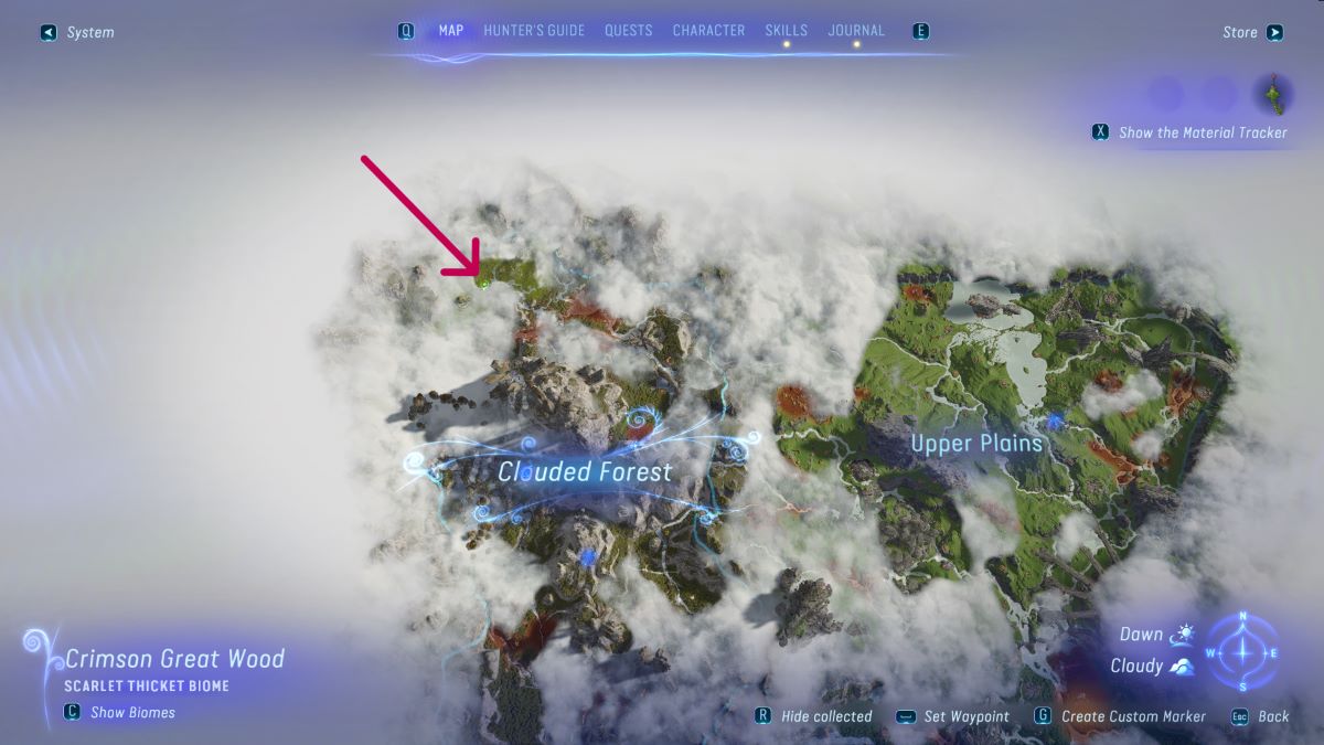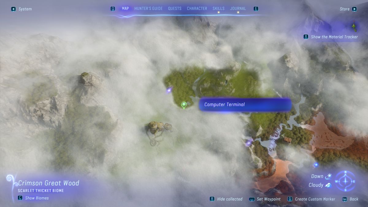 Once you can safely access the northern portion of the Clouded Forest, starting and completing Finding Home Part 10 isn’t any more difficult than any of the other quests. Go to the farthest northwest corner of the Clouded Forest, to the Scarlett Thicket Biome within the Crimson Great Wood. The encampment that houses the Data Terminal is unassuming, so it is easiest to look at the photos below to find it. Also, be aware going to the northwest corner of the Clouded Forest should give you an undiscovered POI for the Data Terminal.