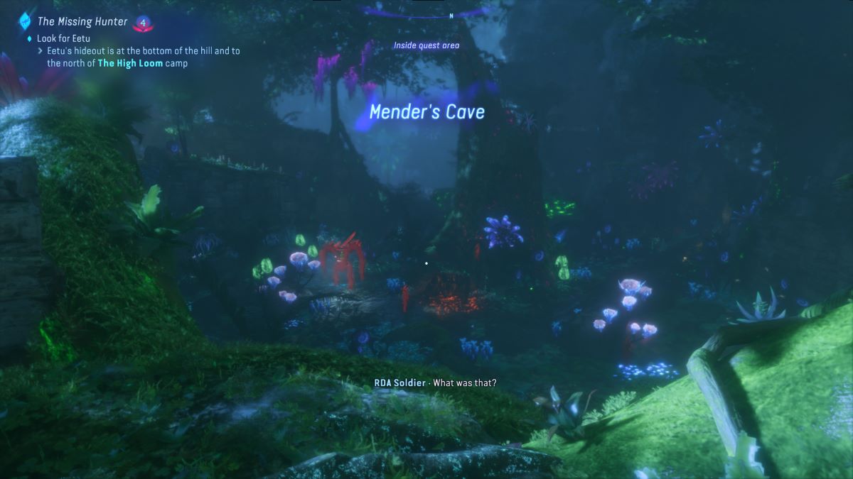 The location of Eetu’s hideout is called Mender’s Cave, which shows up as an on screen discovery prompt when you arrive. Deal with the RDA patrol, and you are ready to investigate the scene.