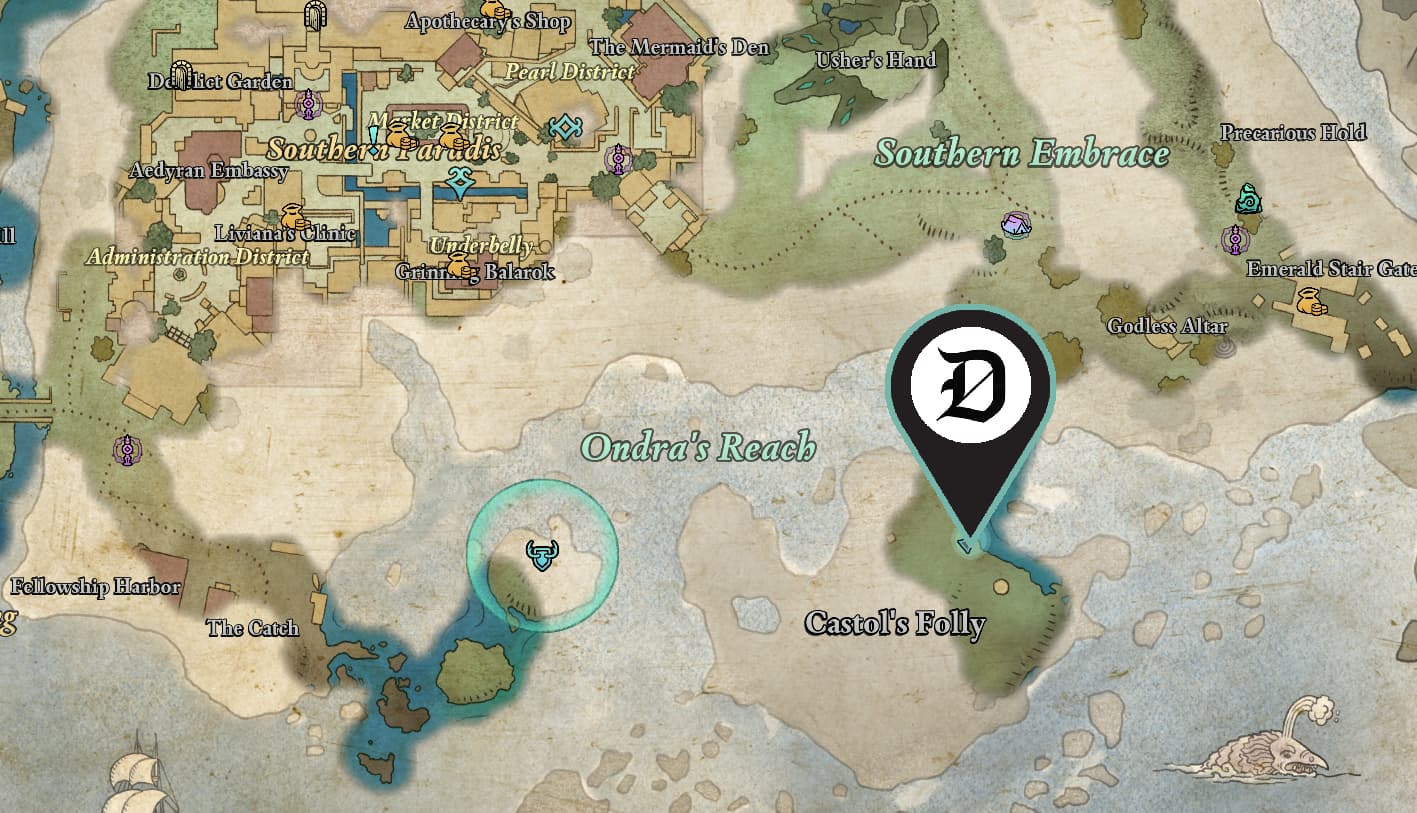 - Location: On the eastern coast of Castol’s Folly, atop pink cloth at an abandoned campsite overlooking the water’s edge.