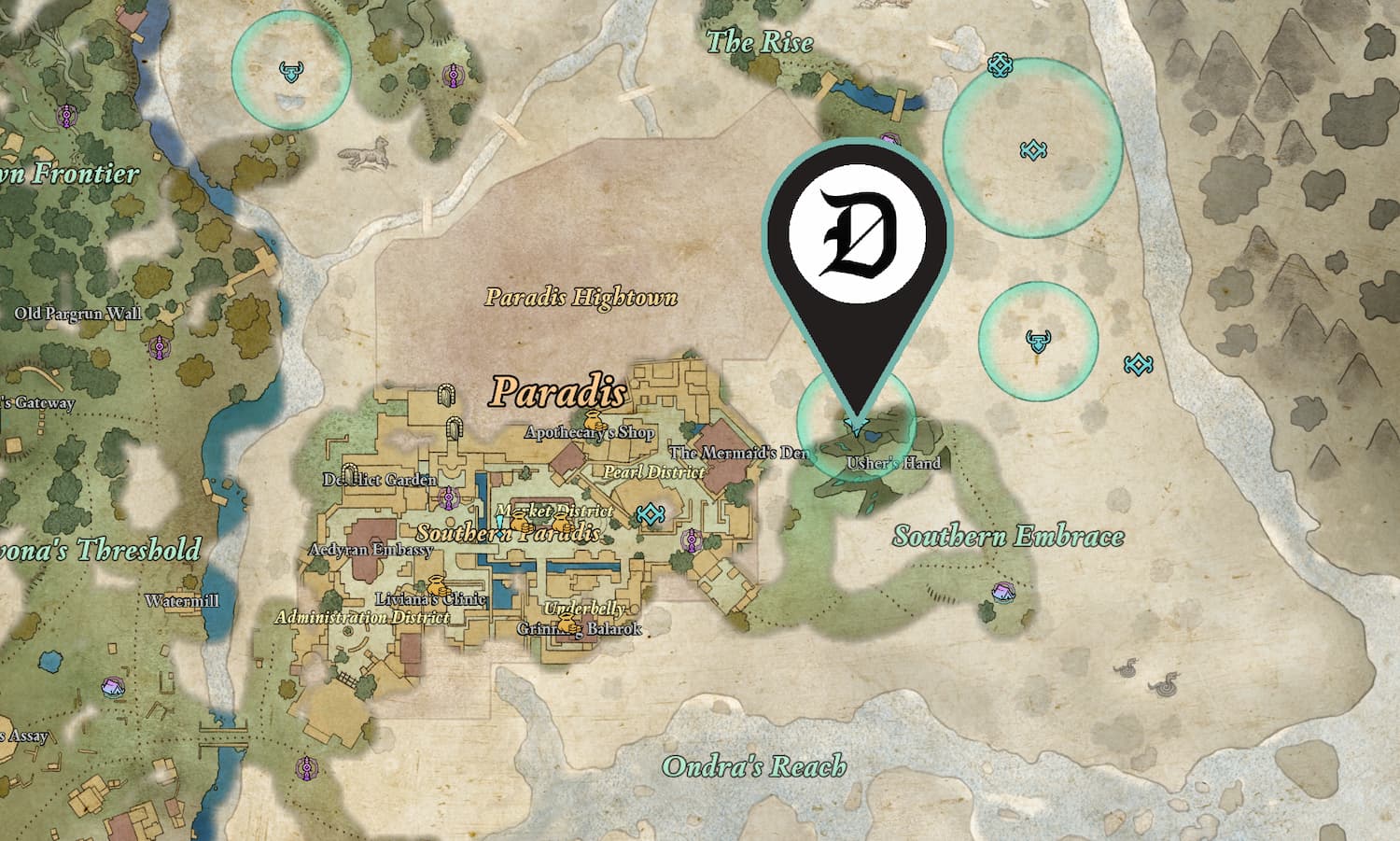 The Golden Plaque of Oaths can be found just east outside of Paradis, at Usher’s Hand. The small cavern where it can be found is blocked off from its surroundings, though, and the only way you can reach it is to dive into a small pond and swim through an underwater opening.