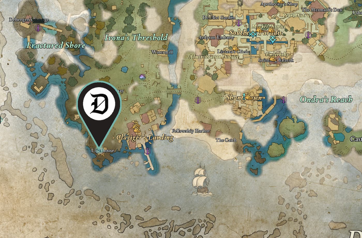 - Location: Towards the top of the derelict lighthouse found west of Claviger’s Landing.
