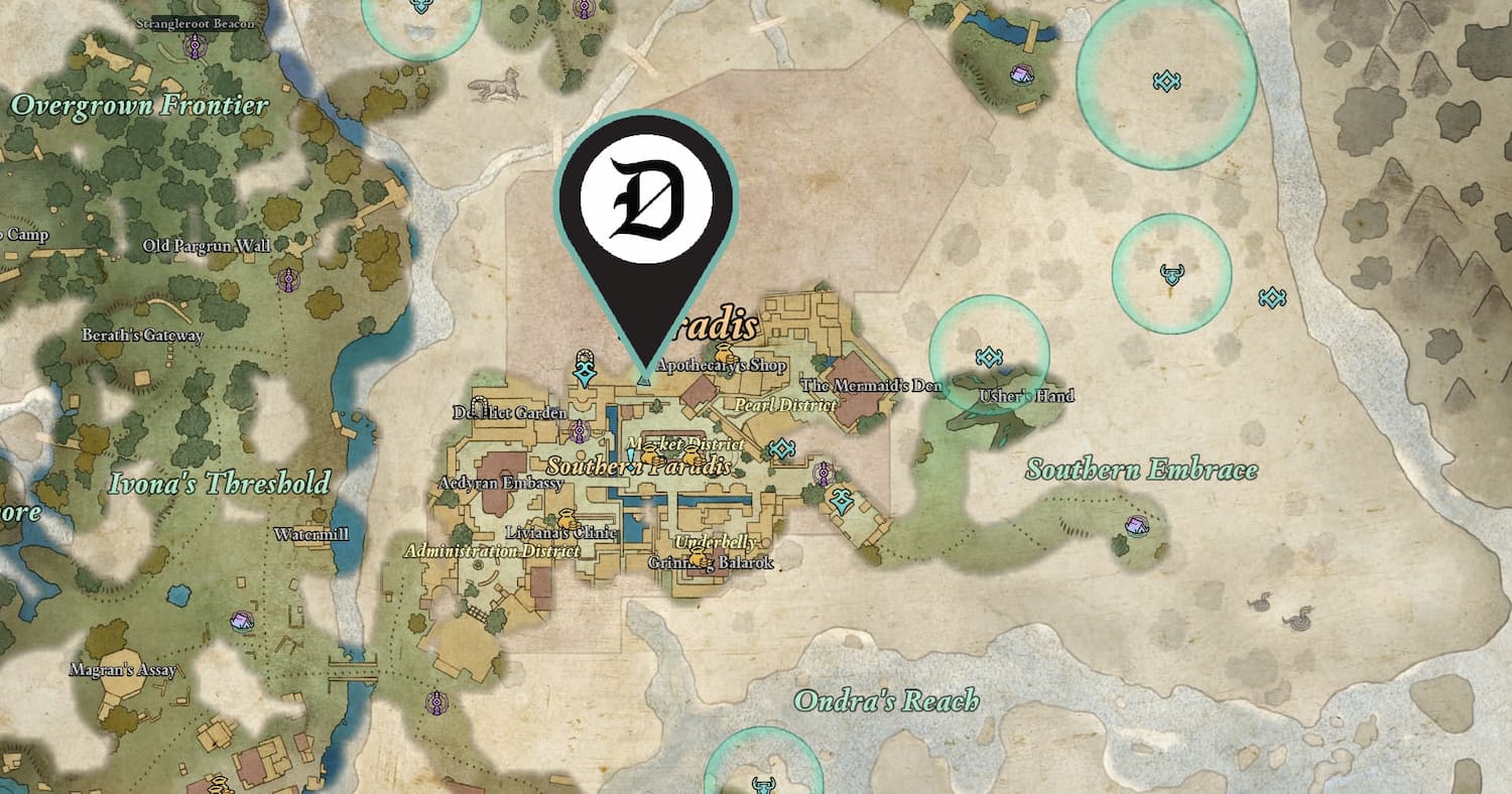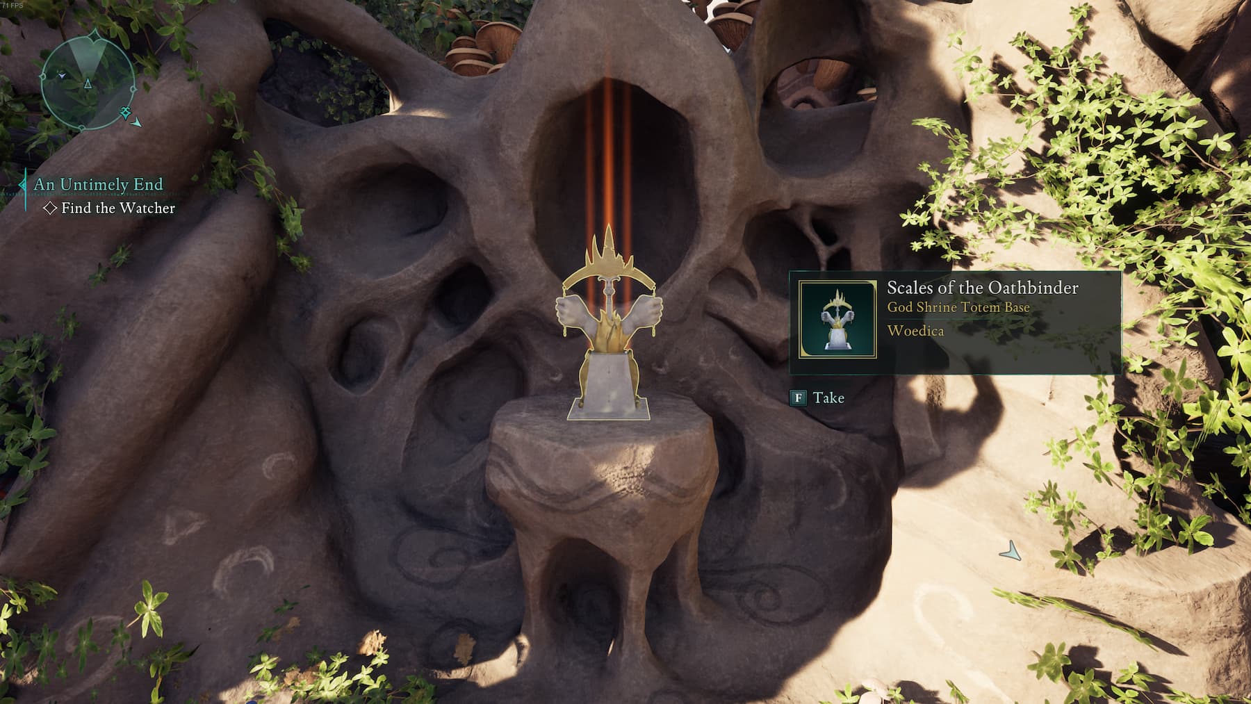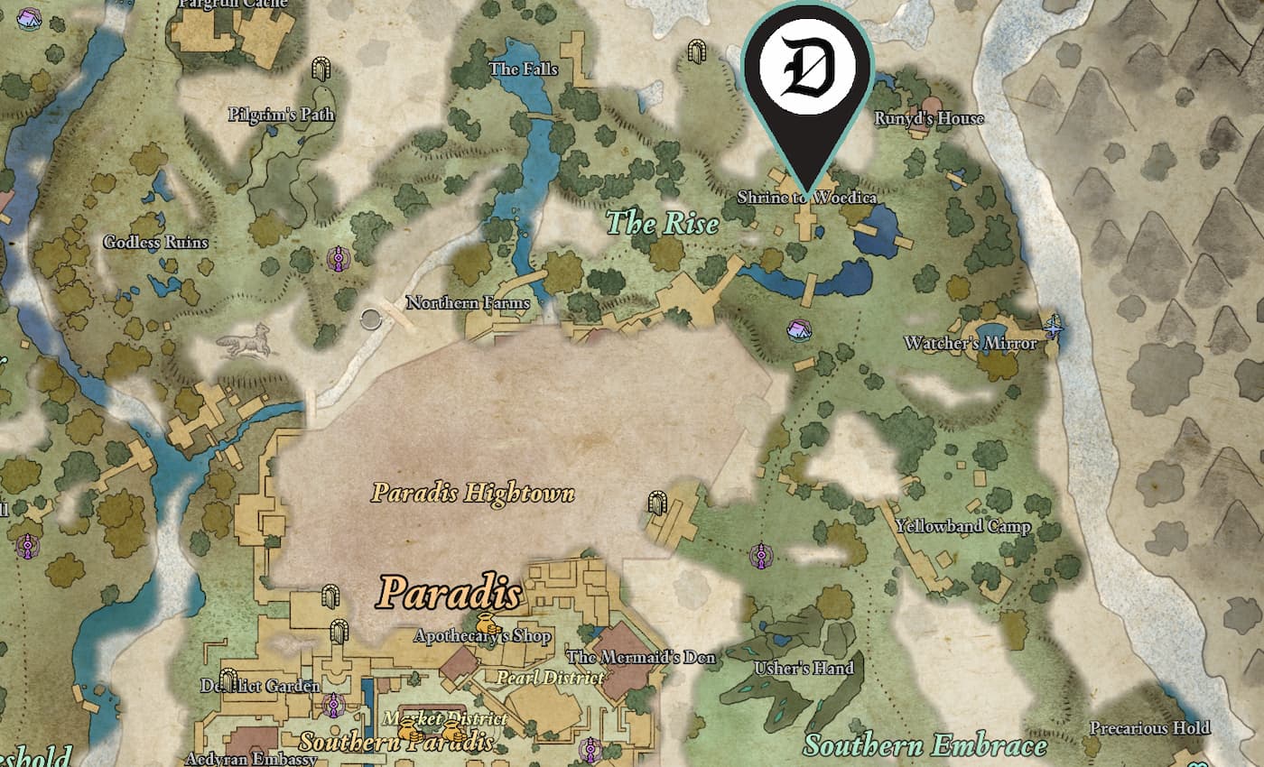 Due east of The Rise, which is north of Paradis, you’ll find a location called Shrine to Woedica. It’s here where you can find the Scales of the Oathbinder Totem Base. The item will be perched on a small table in the middle of the area, and all you need to do is walk up to it and interact with it to add it to your inventory. Luckily for you, no one will question the envoy stealing what’s clearly a worshipped item—so don’t worry about nearby NPCs raising a fuss.