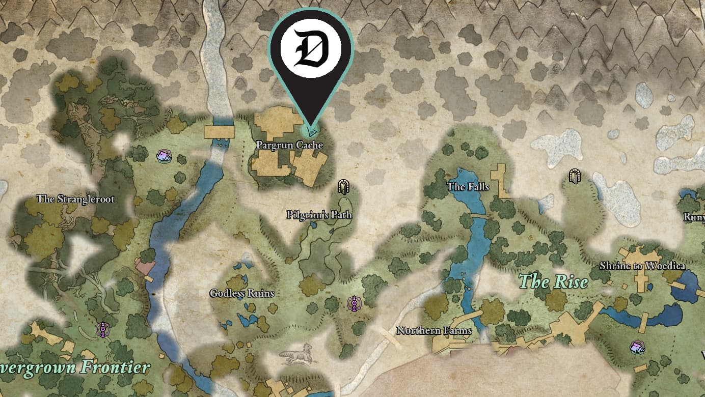 The Golden Scale of Order can be found at Pargrun Cache, shown on the map above. To enter these abandoned Dwarven ruins, approach the location from the west, near the bridge. You’ll find explosive casks that can be destroyed to create a hole in the wall, allowing you to enter and climb the wooden platforms inside.
