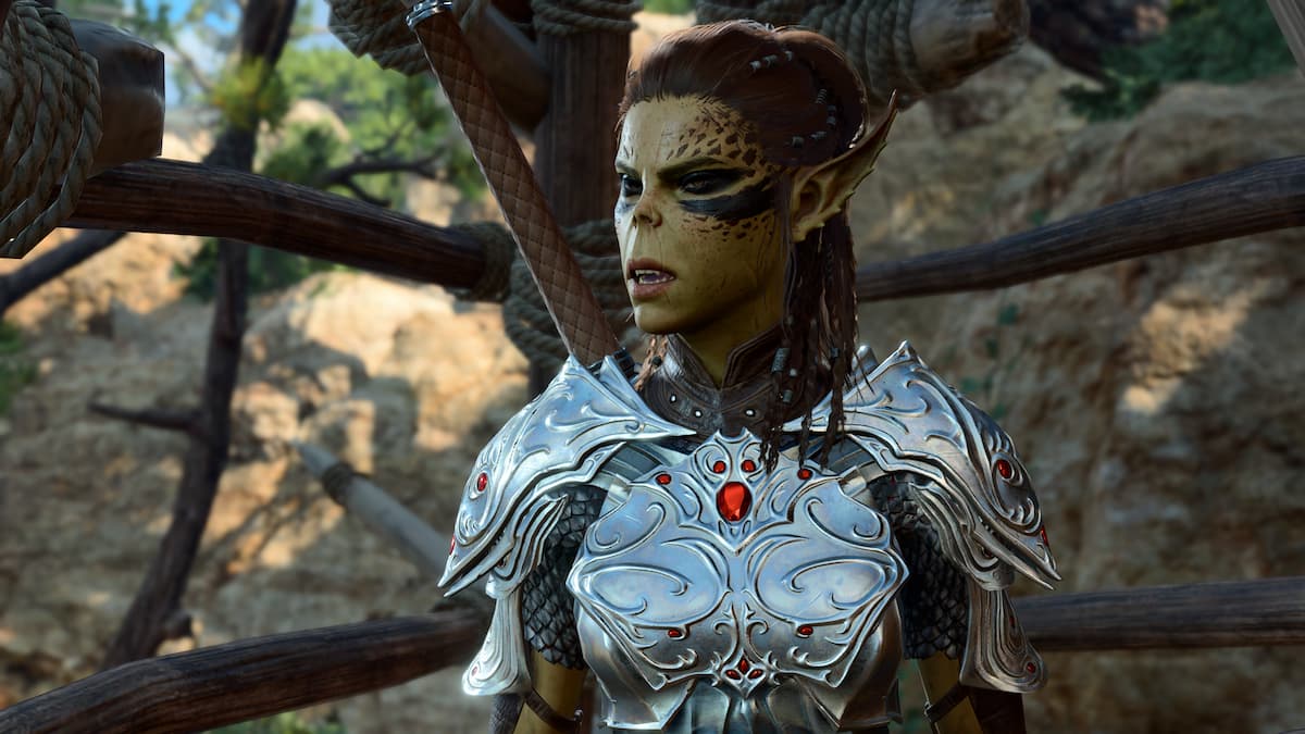 Lae’zel can be found trapped in a cage just to the north of Gale’s location. Two Tieflings are discussing what to do with her when you arrive. You will be able to get Lae’zel down by using a bow, but you also need to deal with the Tieflings. The best option is to simply lie to them, claim Lae’zel is very dangerous, and that they should leave. Before they go, claim you are injured and ask for the location of a nearby camp to make your life easier. Once they are gone, shoot the bottom of the cage she is in to free her.