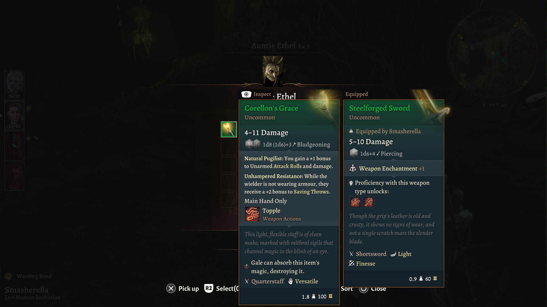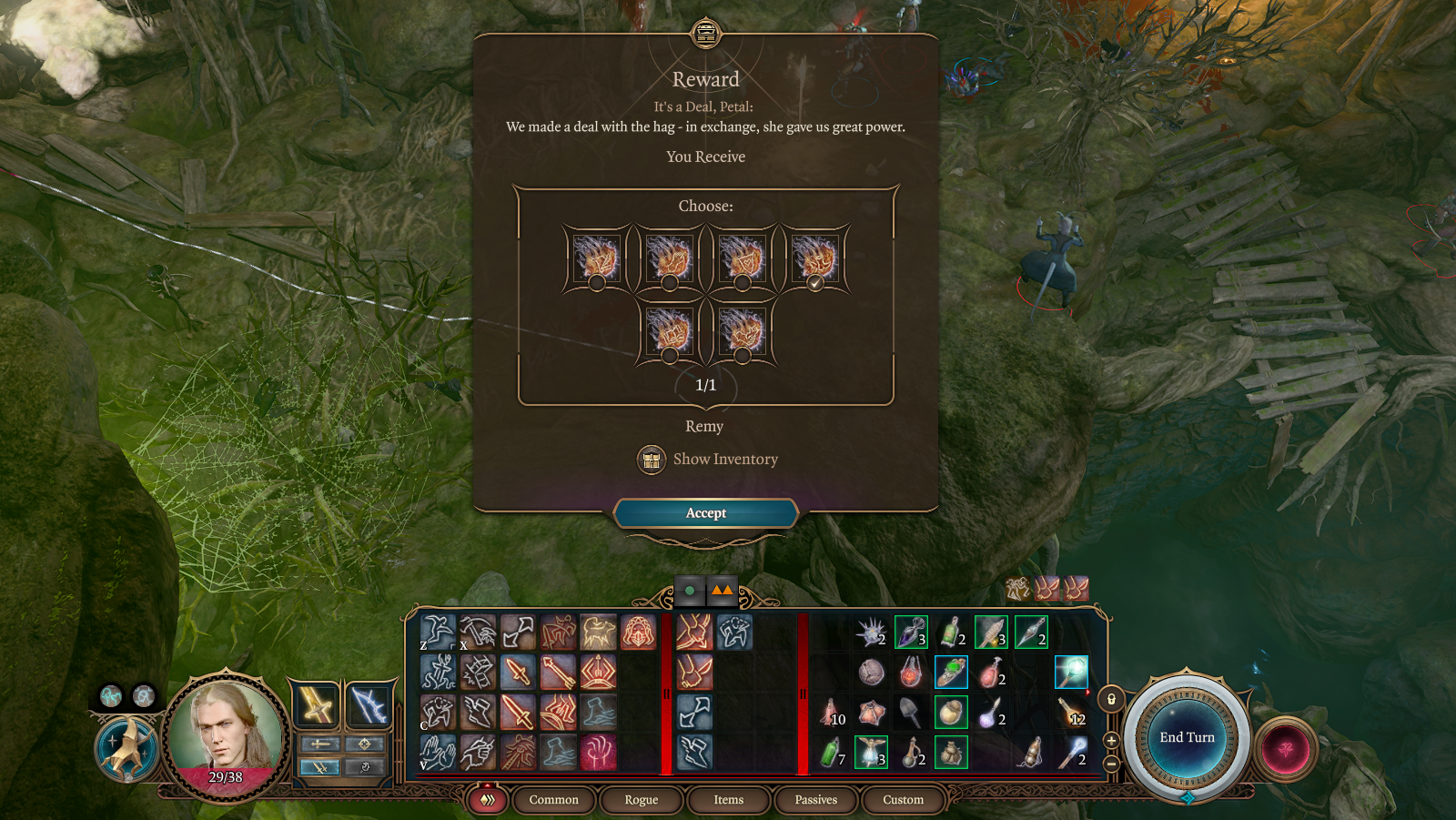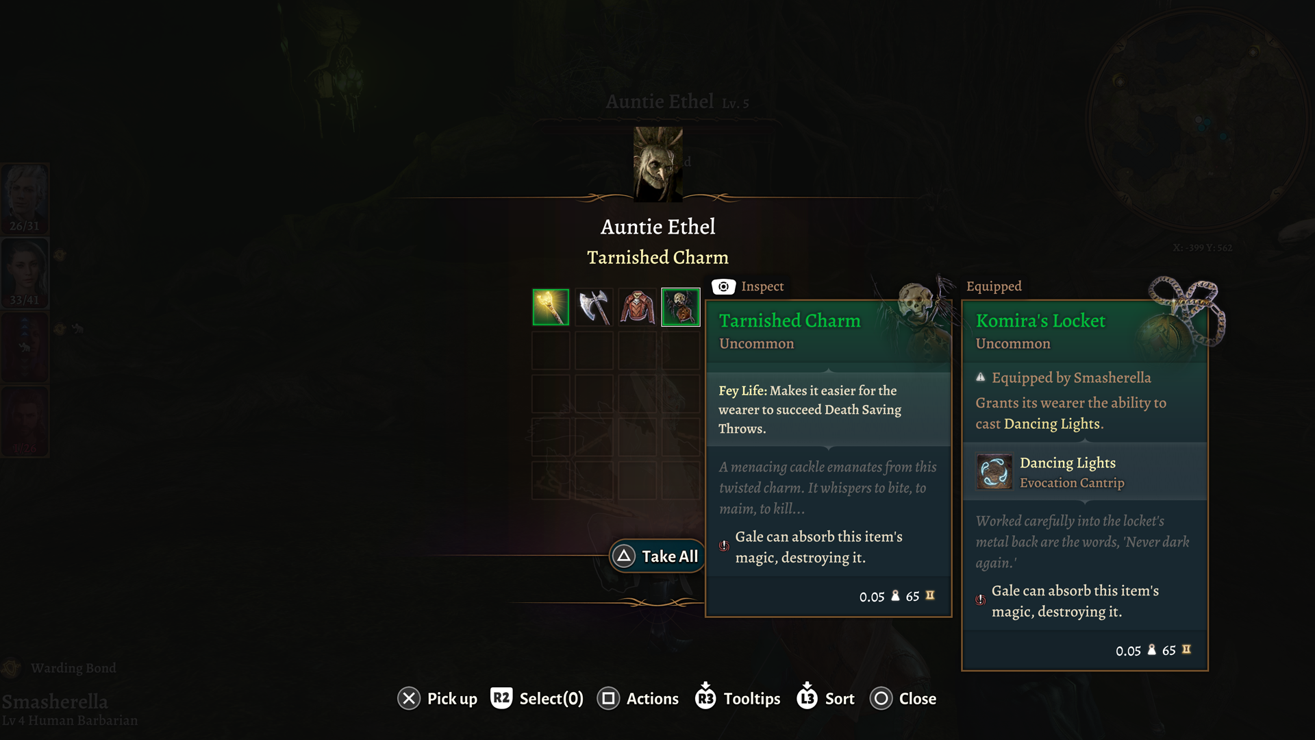 Finish off Ethel and you can nab two items from her corpse the Tarnished Charm and Corellon’s Grace. Some of us chose to let her flee instead and hit on our Intimidation checks. This presents a reward screen that gives players a choice of one single-use item, all of which are called Auntie Ethel’s Hair.