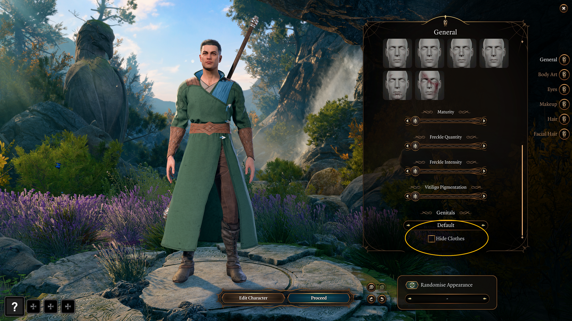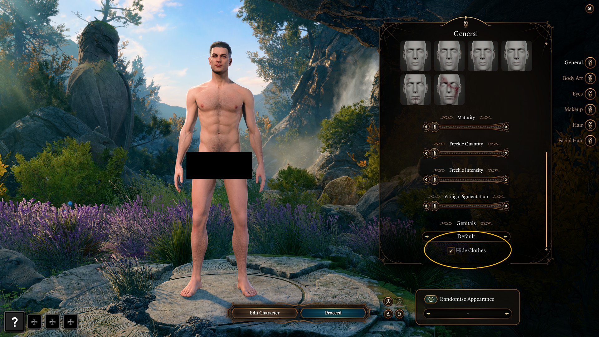 If you want to get a look at your avatar sans clothes just scroll down in the general menu of the character creation screen and click the “Hide Clothes” box. Note that this will show your character in their birthday suit so if you’re streaming to the world, you’ve been warned.