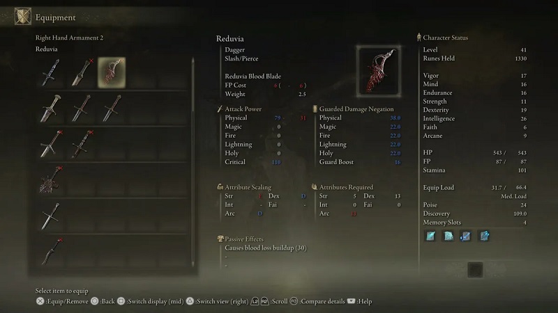 Reduvia is the only dagger-type weapon on this list and with good reason. Dagger weapons are generally limited in terms of hand-to-hand usage because of their terrible attack range. Thankfully, the high attack speed of this weapon combined with its great Arcane scaling makes the Blood Loss build up pretty quick at max level. If that was not enough, its special ability, the Reduvia Blood Blade, launches a malicious-looking projectile at the enemy, causing huge Blood Loss buildup from a long distance.