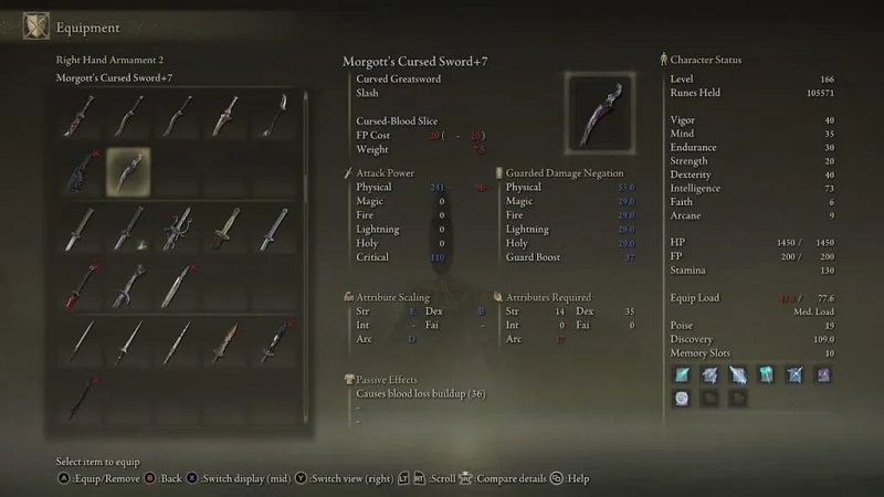 Morgott’s Cursed Sword is a curved greatsword that is pretty light for its weapon type. Being a greatsword entails a primary Strength scaling. However, since it is a curved greatsword, it scales off Dexterity instead, with Strength being a secondary stat. It has an Arcane scaling as well, which adds to its Blood Loss procs. The Cursed Blood Slice skill it provides uses Bloodflame effects on strike while also adding to the Bleed buildup over time.