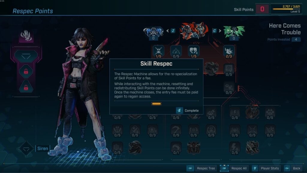 Approach one of these Respec Machines and hold the interact button (Square button for PlayStation controller and E on keyboard) to open the menu. The Machine will show a skill tree replica and the cost to respec. This cost should depend on your level.
