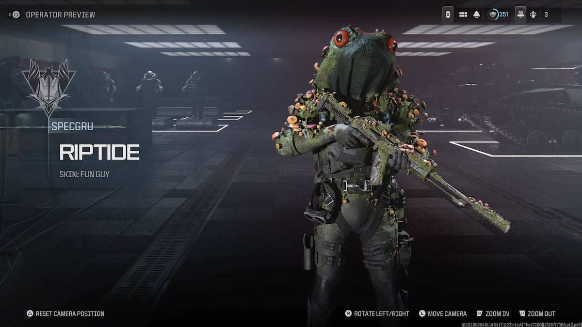 The 2,400 CoD Points bundle comes with the “Fun Guy” skin for Riptide, sporting what looks like a normal wetsuit on their lower half and a frog head covered in mold and growing fungus on their top half. And it’s as odd as it sounds.