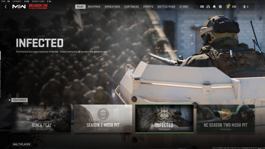 For now, the Featured tab of the MW2 menu includes Quick Play, Season Two Mosh Pit, Infected, and HC Season Two Mosh Pit.