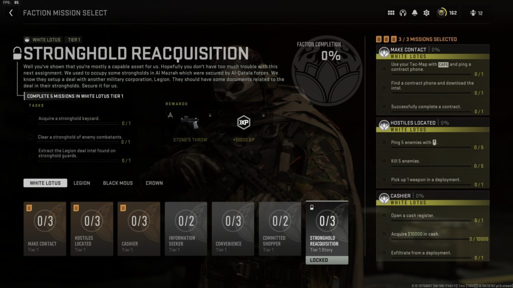 White Lotus is the starting set of faction missions, and you will have to complete the first tier story mission, Stronghold Reacquisition, to unlock Crown. Completing this mission will also unlock the first tier of Legion faction missions, and it is also part of the requirements for unlocking the Black Mous faction missions.