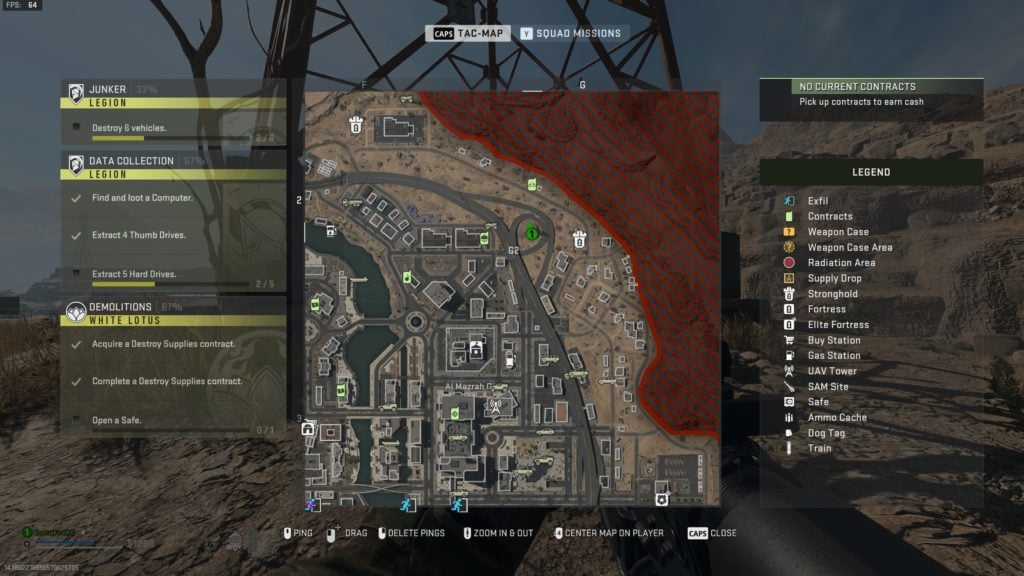 Unlike some other dead drops, this one isn’t in a dumpster. It’s a small toolbox located under a tall relay tower that is just northeast of Al Mazrah City, located in the G2 coordinate. The tower is elevated on a rock formation in the middle of a roundabout, but you can climb up the rock rather easily. The bottom of the tower is pretty exposed, however, so watch out.