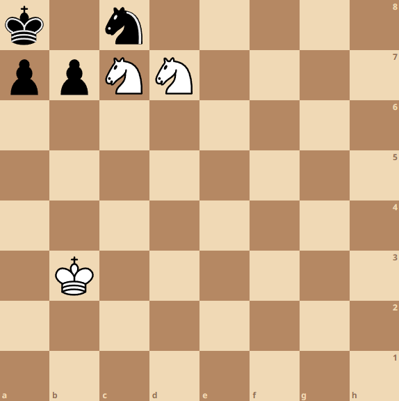 The double knight checkmate tends to emerge with more pieces on the board, where the other pieces blockade the king’s potential escape routes. Nevertheless, it is still quite rare to see such positions because neither knight can be captured on their approach towards the king.