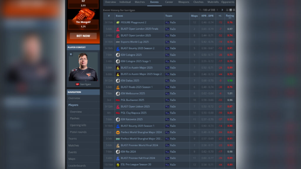In the last 10 events FaZe attended, karrigan was able to tally a rating of more than 1.0 in only a single instance—during IEM Dallas 2025, where he secured a 1.10 rating over seven maps. FaZe finished 11th in that tournament. His ratings in the other nine events were below 1.0.