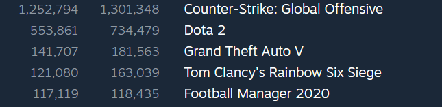 CS:GO peaked at 1,301,348 players earlier today, according to the Steam and Game Stats page, officially hitting the highest mark in franchise history while also maintaining the top spot overall on Steam.
