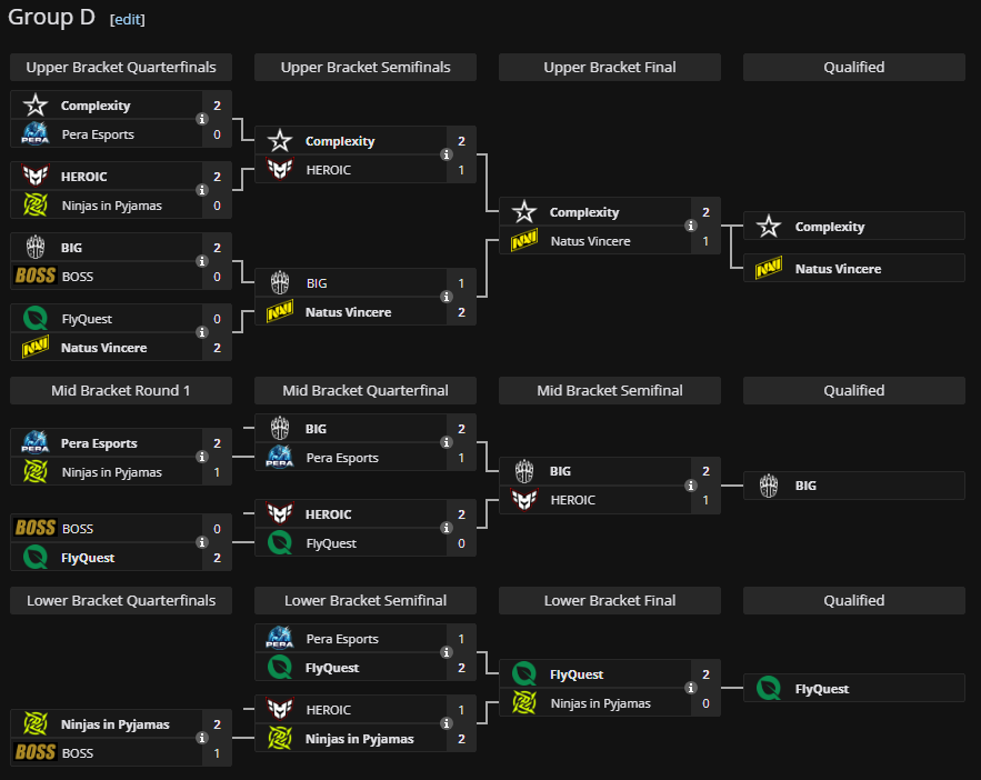 - Playoffs round one. G2 advances to round two, BIG is eliminated.