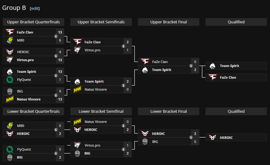 - Group B upper bracket final. Spirit proceeds to the semifinals, FaZe proceeds to the quarterfinals.