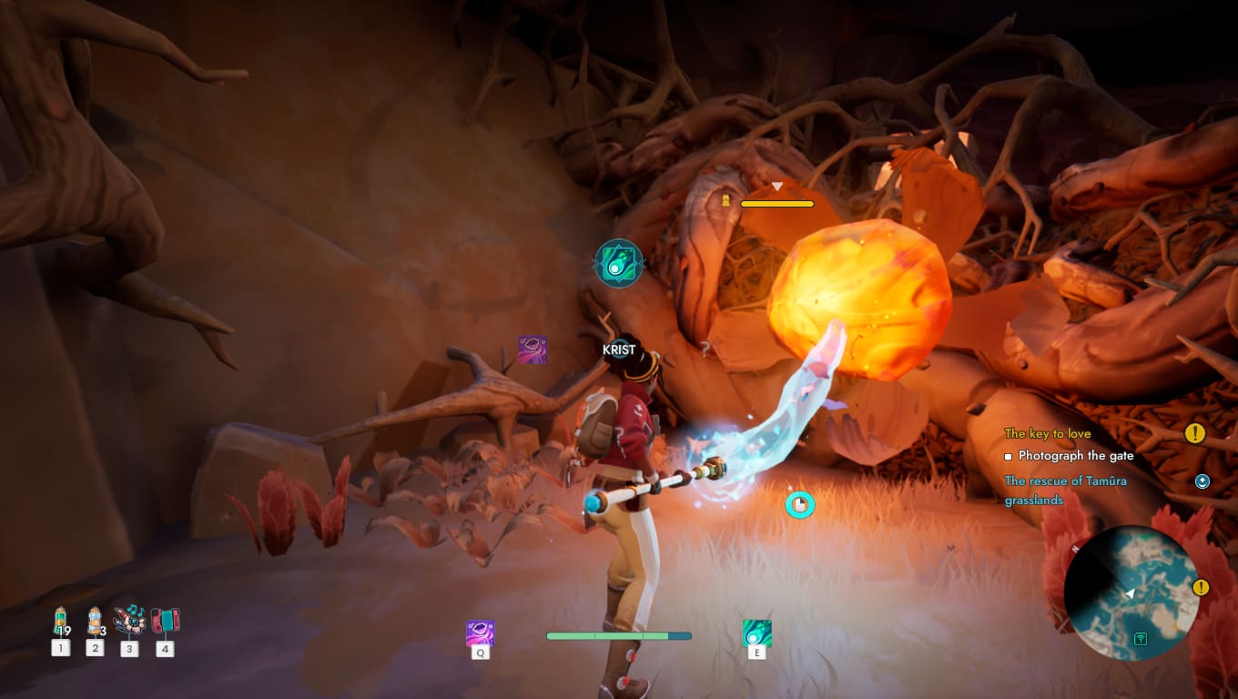 To get rid of Yellow Witherbloom in Creatures of Ava, you need to unlock and use the Krist ability with your Nafitar. The Krist ability allows you to temporarily remove the immunity of the Yellow Witherbloom to resist your Nafitar’s beam, helping you neutralize them quickly. To use the Krist ability, simply use your beam on Yellow Witherbloom and press E to release the Krist to weaken the infection, and you’ll absorb it easily.