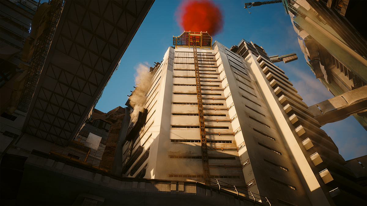 To get up to the supply drop, approach the building where the smoke is coming from. There’s an elevator at the base you can take up to the top.