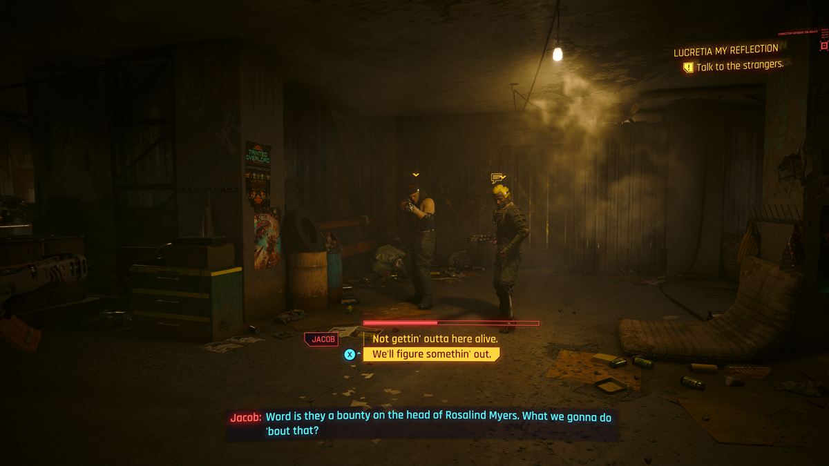 Upon arriving at the safehouse where you and President Meyers are supposed to meet Songbird you instead get to make the acquaintance of a couple of Dogtown locals. Are they friend or foe? You’ll have to choose.