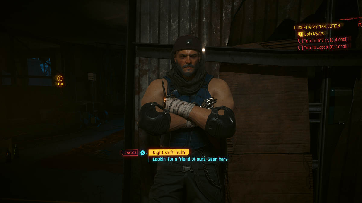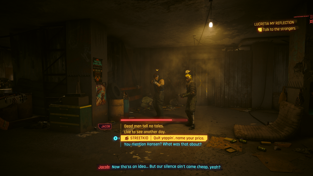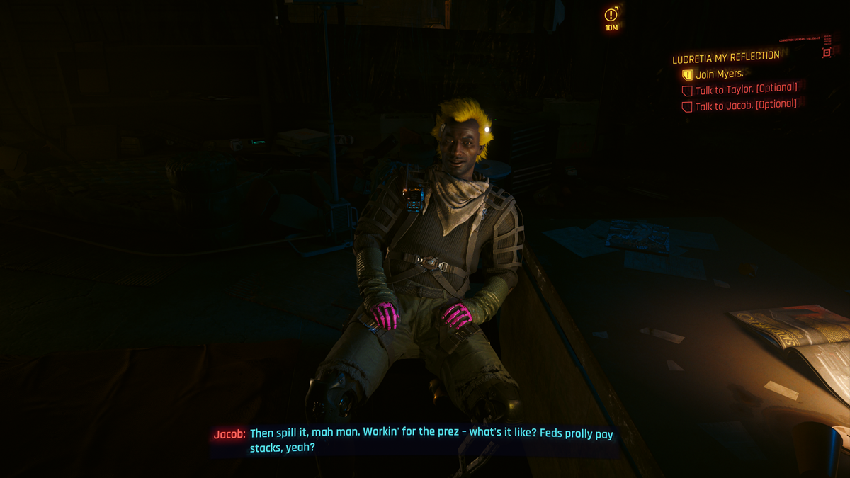 Turns out they both have no love for Kurt Hansen and in return for a million eurodollars they’ll help you and the President. You can speak to them to get a little bit of background, like how Jacob lost his leg to Kurt Hansen’s goons and Taylor used to be a nomad but betrayed his people.