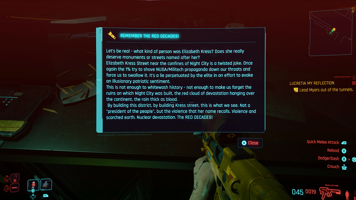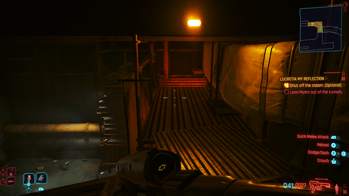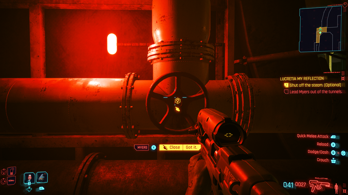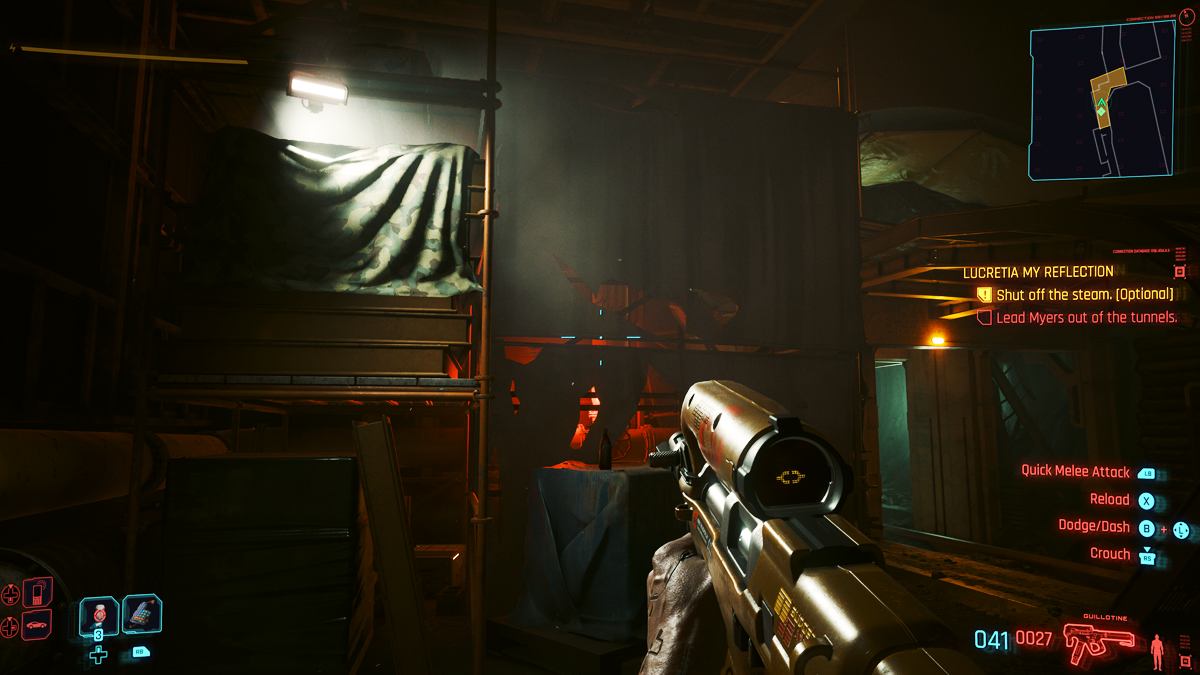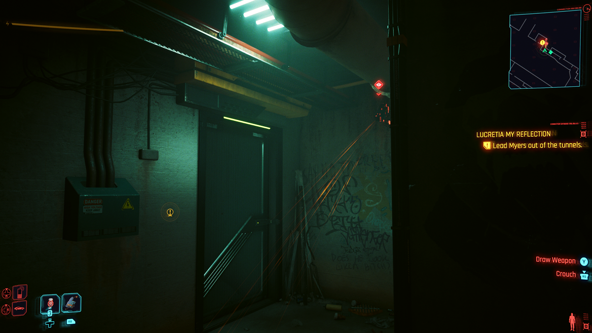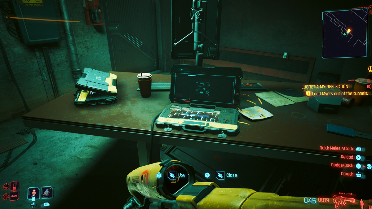 With the steam off, head back to the hallway and through the crawlspace. At the end of the hall, there will be another camera and a door. The door leads into a control room where you can delete the camera footage if you were spotted. There’s also a bit of lore on the table if you want to really immerse yourself in the finer details of Phantom Liberty’s story. There are also a few items and consumables on the table you can grab.