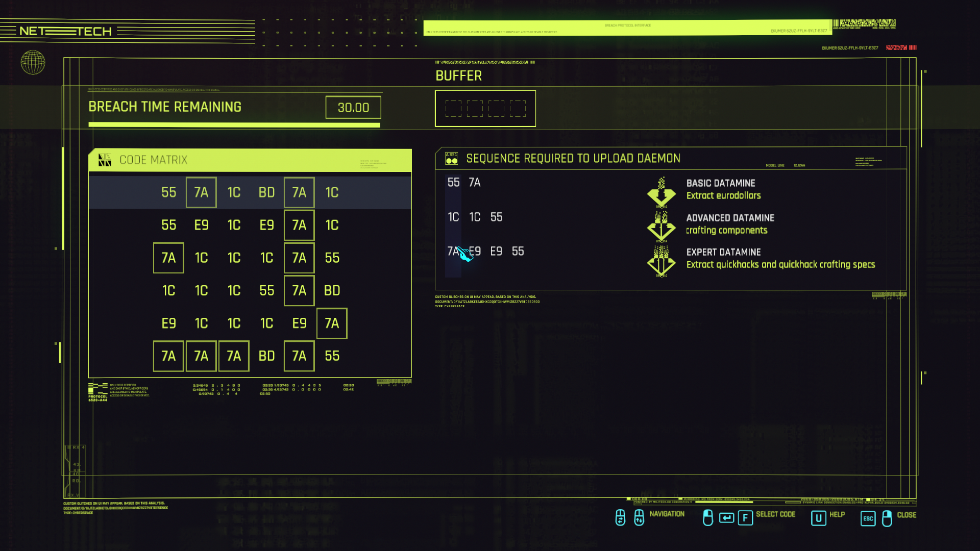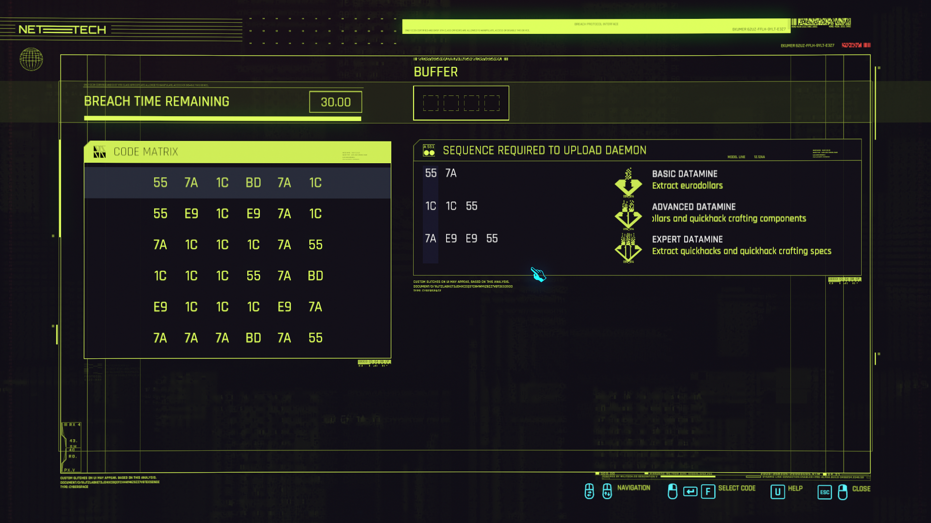 - Breach Protocol (used for hacking Access Points and earns rewards).