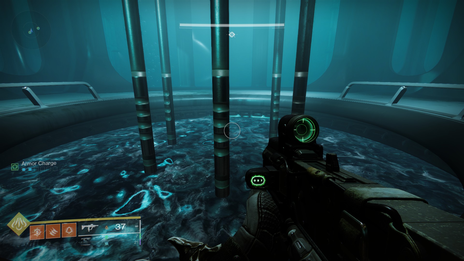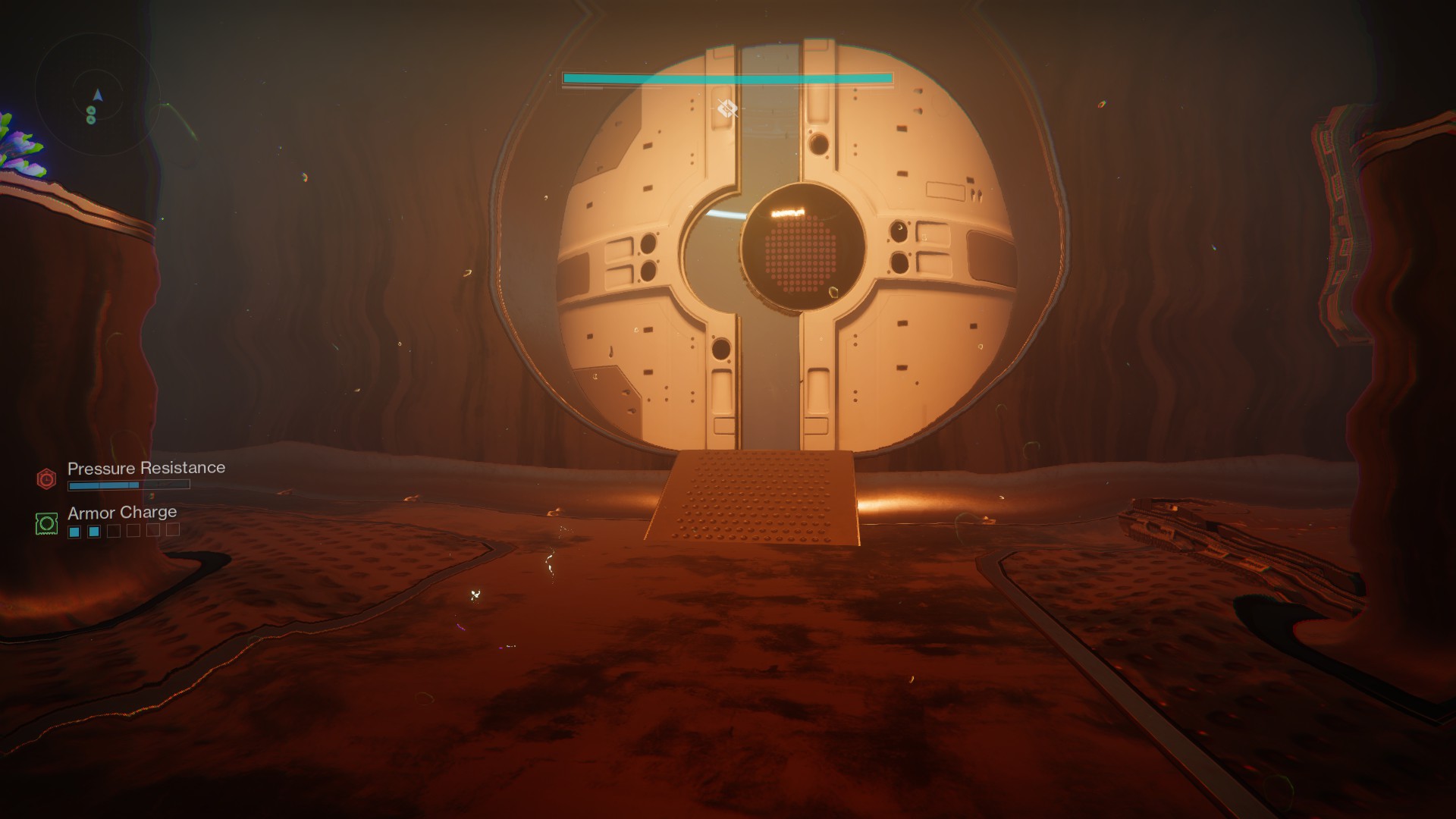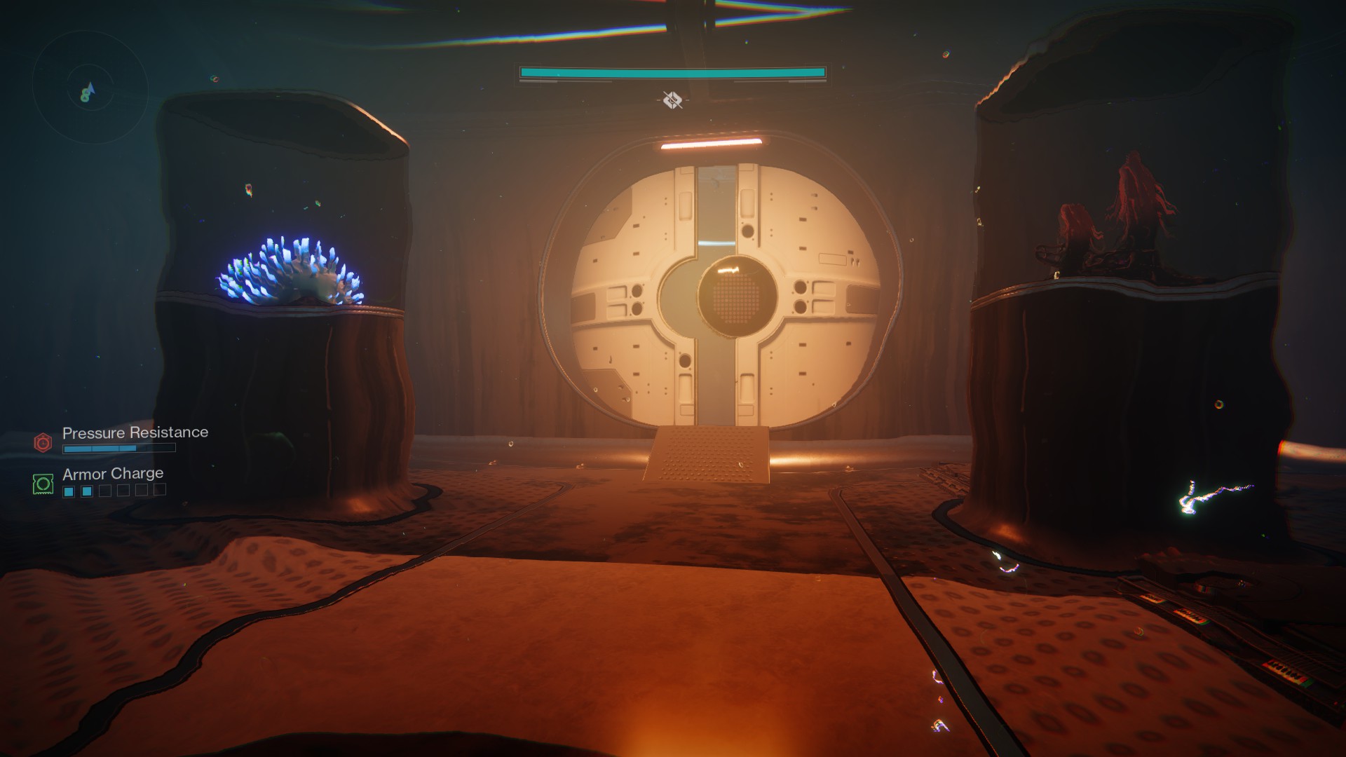 Continue along the way right after this collectible, and you’ll soon see a pool with six beam-like structures leading to the ocean below. Inside, you will find a room with a clearly marked door that drops down below and leads to the rest of the dungeon. Before you continue, look around for a half-open door below a red light. It’s not fully closed, so it’s large enough for your guardian to pass through—and you’ll even find some air bubbles on the other side in case you need them.