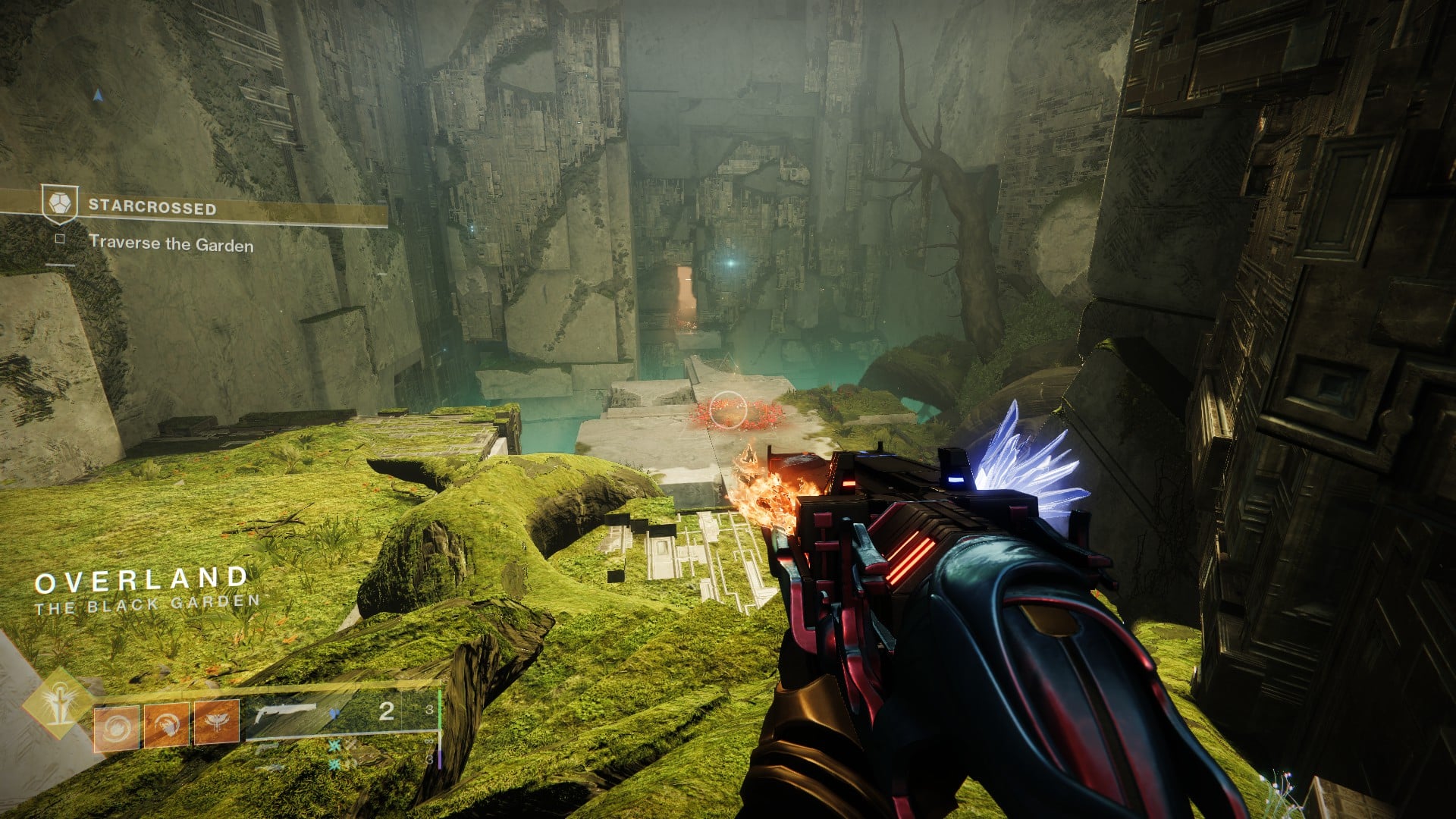 After clearing out the first combination lock in the Overland, you’ll come upon an area called the Roost, where you’ll get the Dam’s Gift buff. Pick it up, then look to the left before passing through the door to spot a pool of the blue buff. Step on it to upgrade your buff to Crowned by Dragons and go through the spot right in front of you.