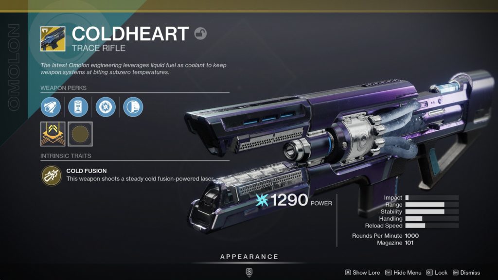 The original trace rifle is Coldheart, a cold fusion-powered laser energy weapon that deals Arc damage. Coldheart was originally introduced as a pre-order bonus prior to the release of Destiny 2, but eventually found its way into the Exotic engram rotation just a few months later by the end of 2017.